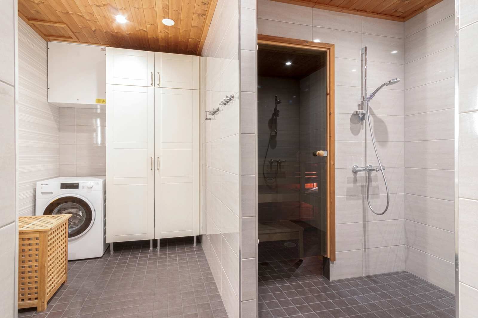| Saunan pinnat | Seinät: puu Lattia: laatta |