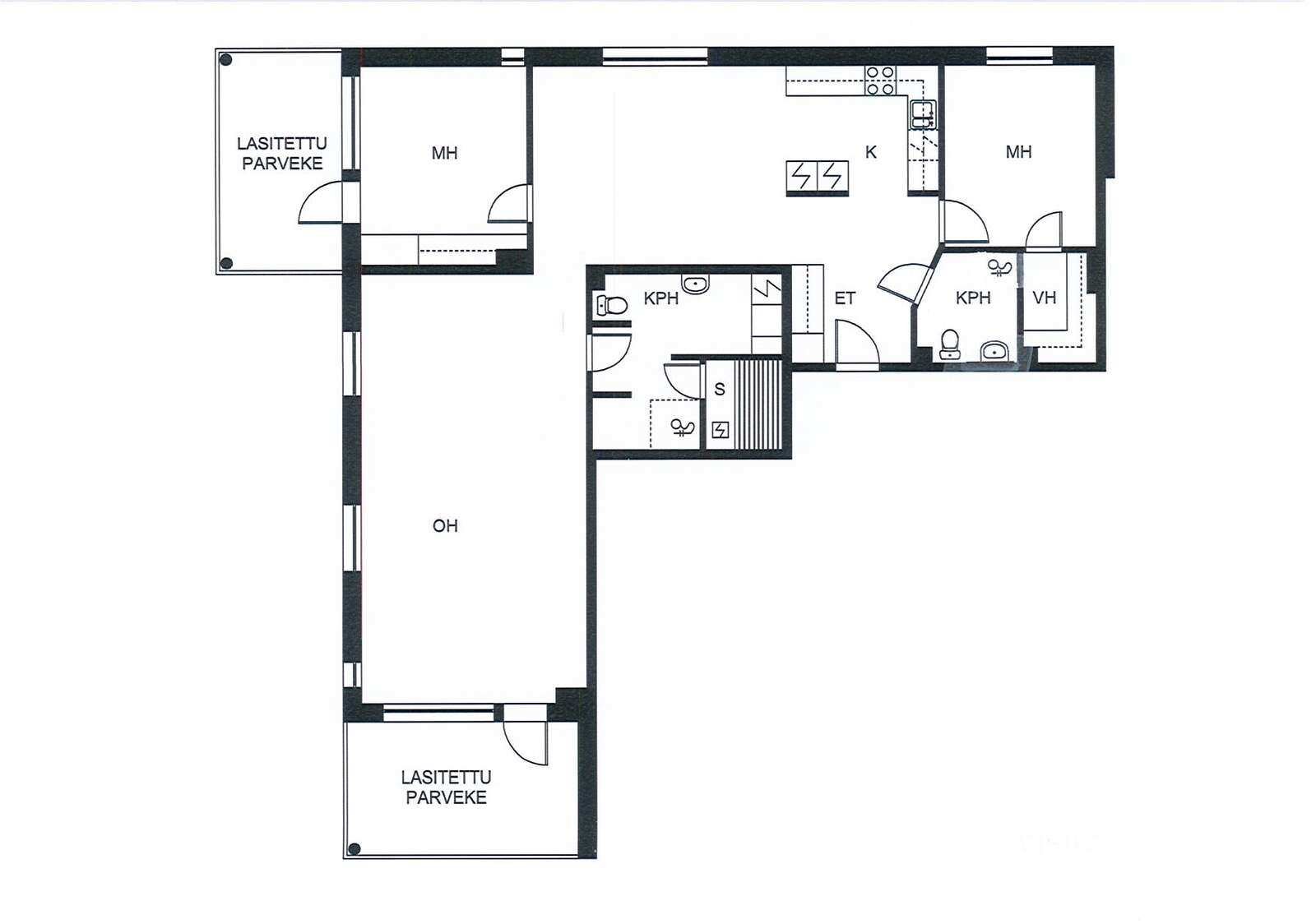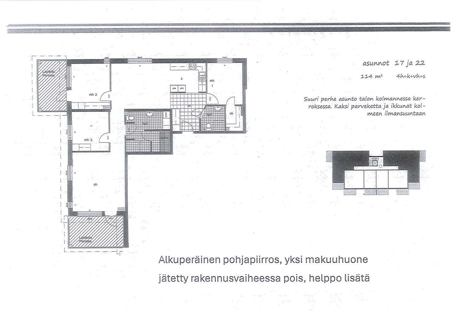 | Huoneistoselitelmä | 3-4h,k,sauna,psh,2xwc,vh,2x parveke |