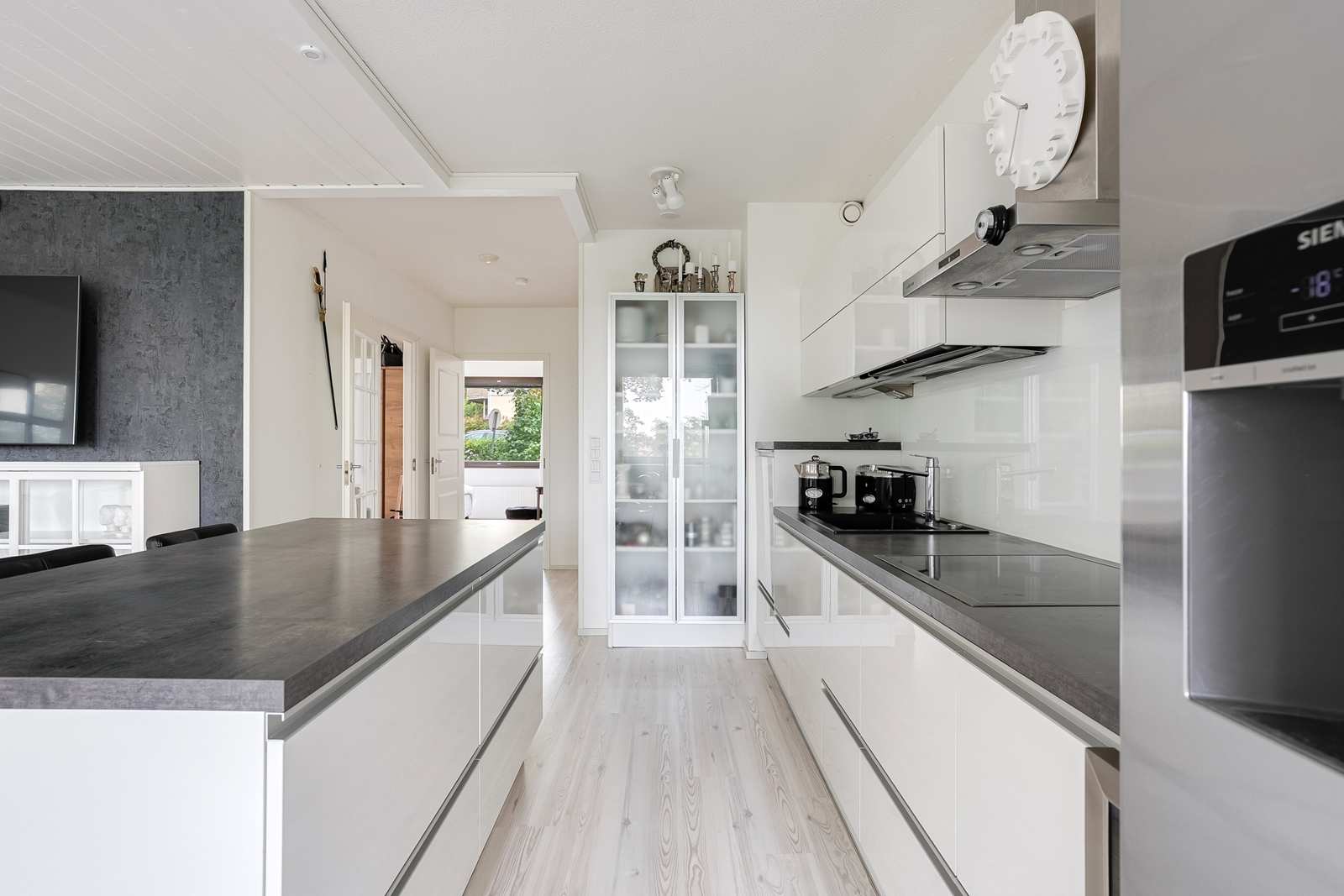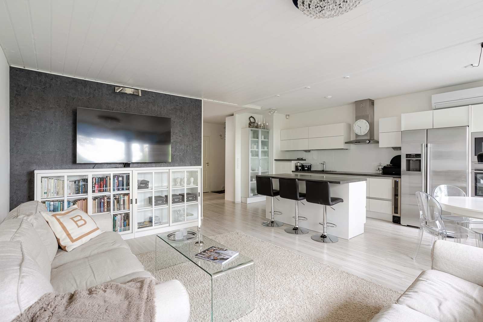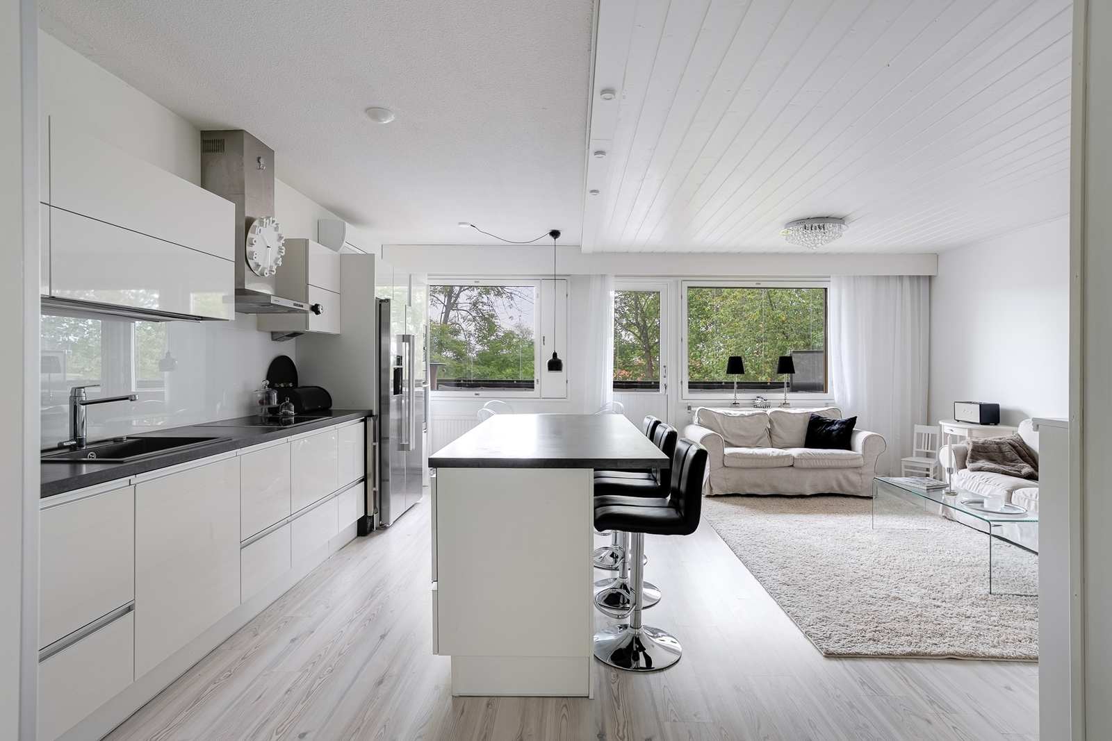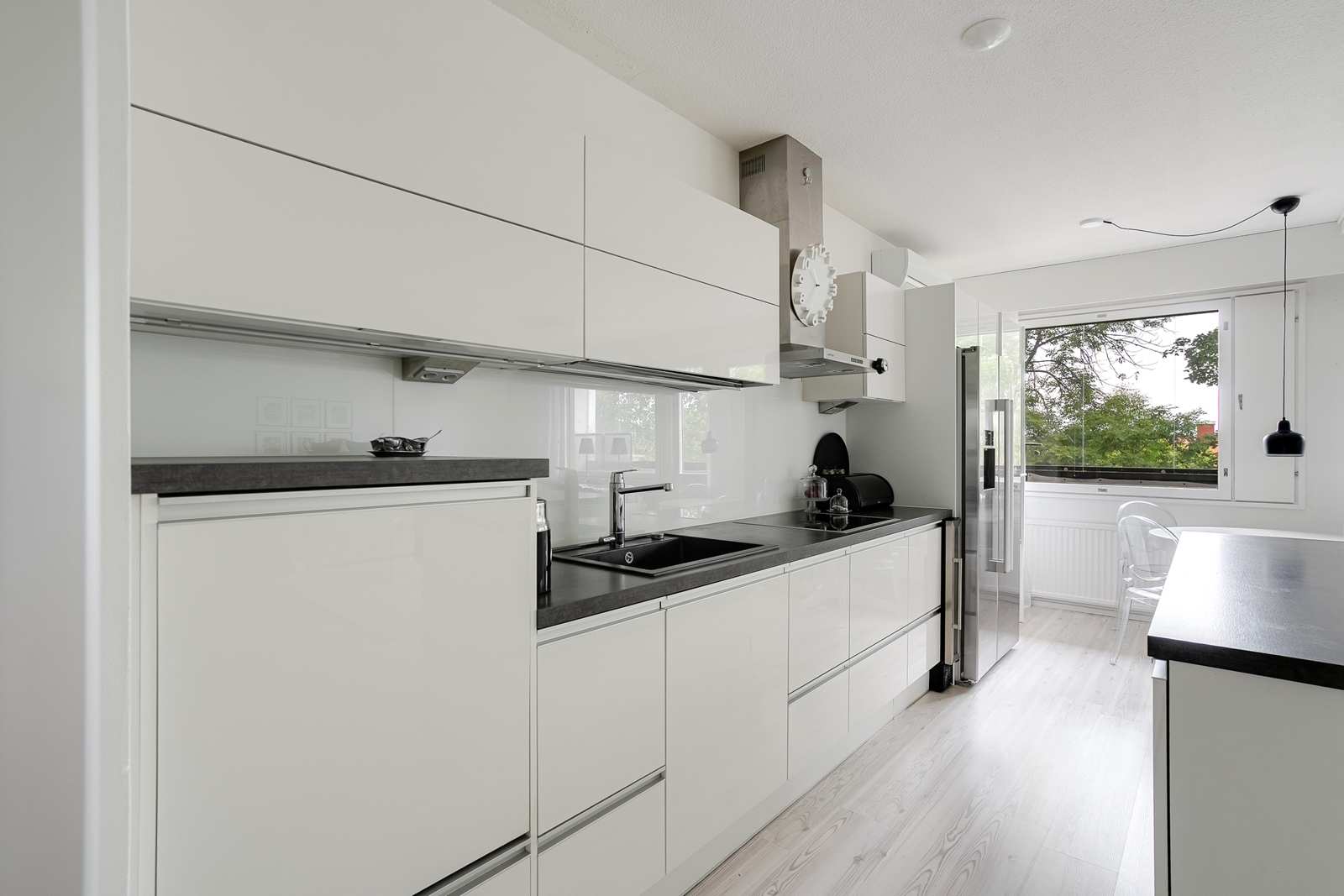 | Keittiön varustus | Jääkaappi ja pakastin: jääkaappi/pakastin, viinikaappi Tasot: laminaatti Seinät: maalattu Lattia: laminaatti Muut varusteet: liesituuletin, mikroaaltouuni, astianpesukone Liesi/uuni: induktio  |