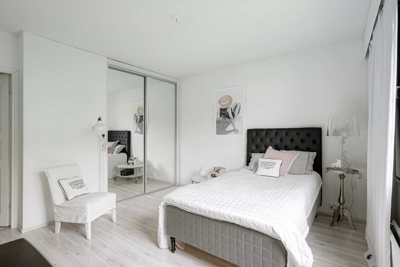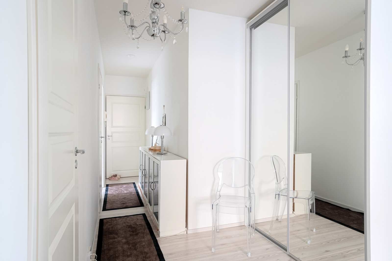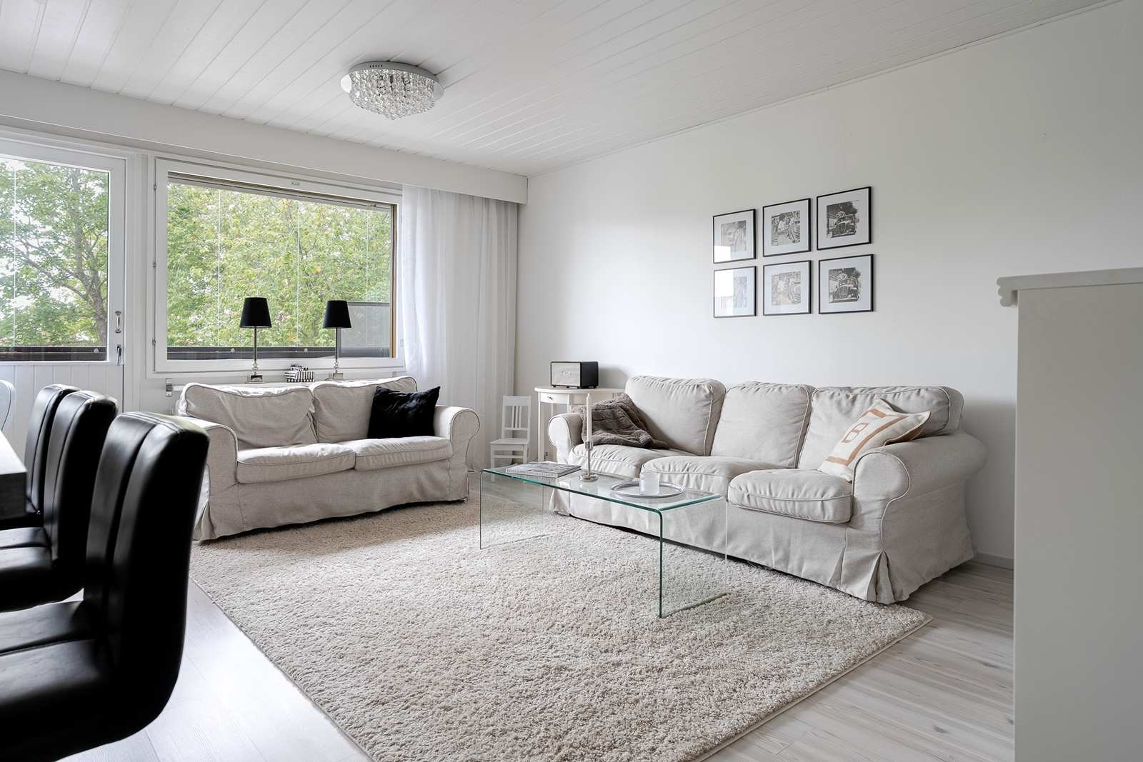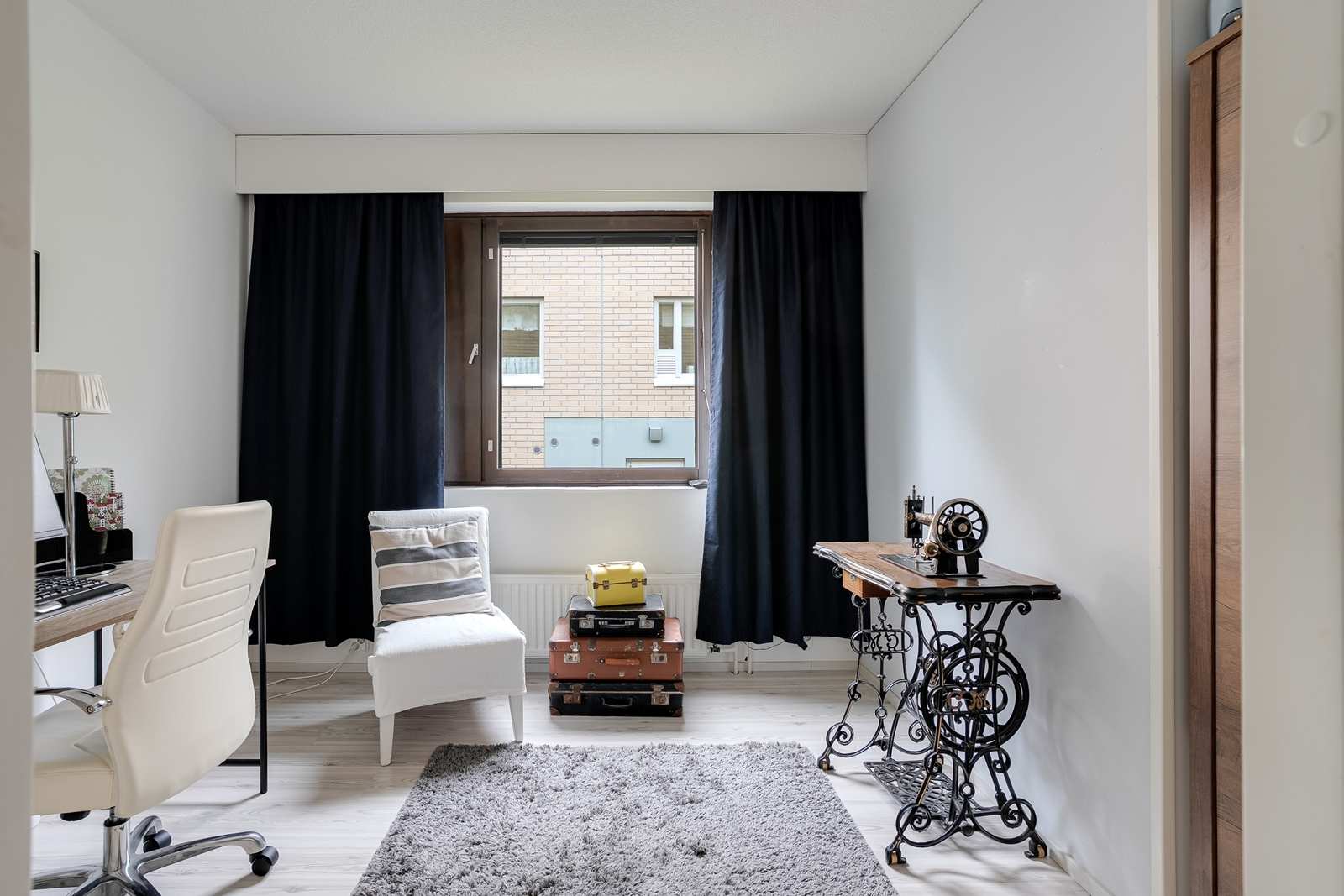 | Olohuone | Suuri olohuone, kaupunkimaisemat. Olohuoneesta sujahdat lasitetulle parvekkeelle Seinät: maalattu, tapetti Lattia: laminaatti  |