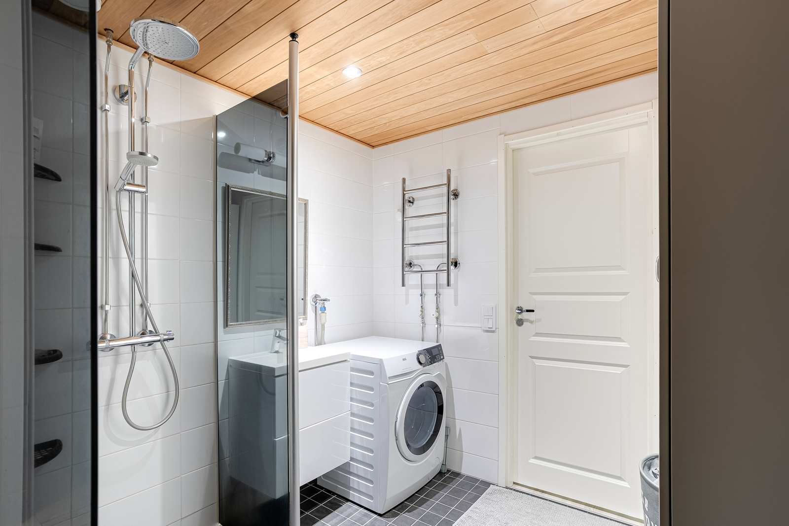 | Kylpyhuone | Varusteet: pesukoneliitäntä, kuivauskaappi, suihku, peilikaappi Seinät: kaakeli Lattia: laatta  |