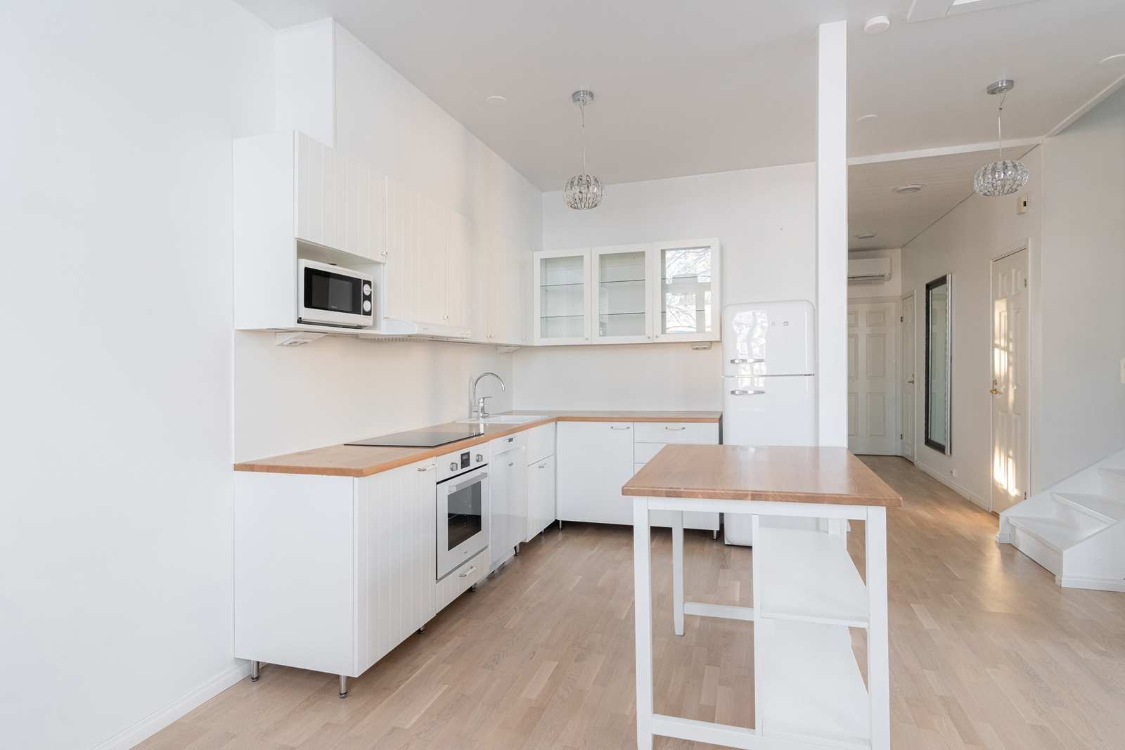 | Keittiön varustus | Jääkaappi ja pakastin: jääkaappi/pakastin Tasot: laminaatti Seinät: maalattu, muu Lattia: parketti Muut varusteet: astianpesukone, liesituuletin / suodatin Liesi/uuni: induktio |