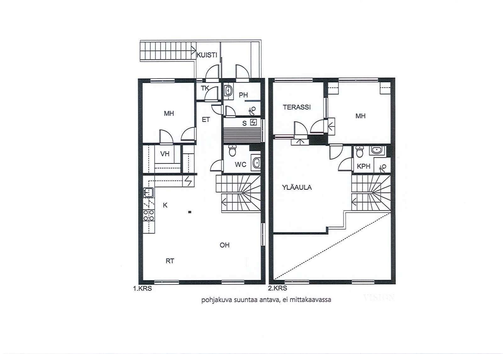 | Makuuhuone | Alakerrassa makuuhuone, yläkerrassa makuuhuone sekä avonainen aula josta näköyhteys olohuobeesern |