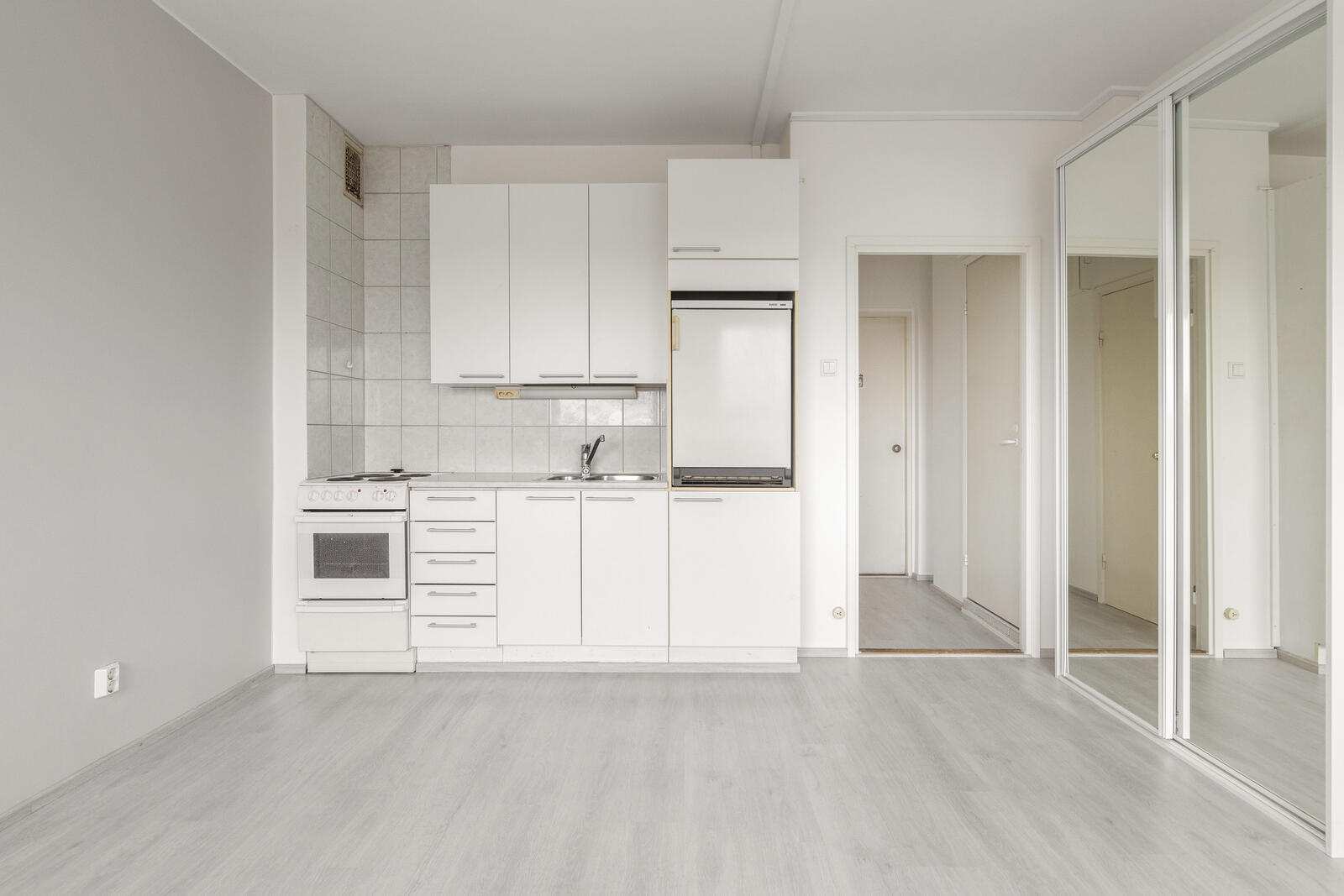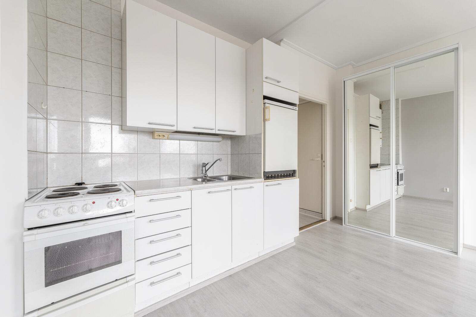 | Keittiön varustus | Jääkaappi ja pakastin: jääkaappi/pakastin Muut varusteet: liesituuletin Tasot: laminaatti Seinät: maalattu Lattia: laminaatti Liesi/uuni: sähköliesi |