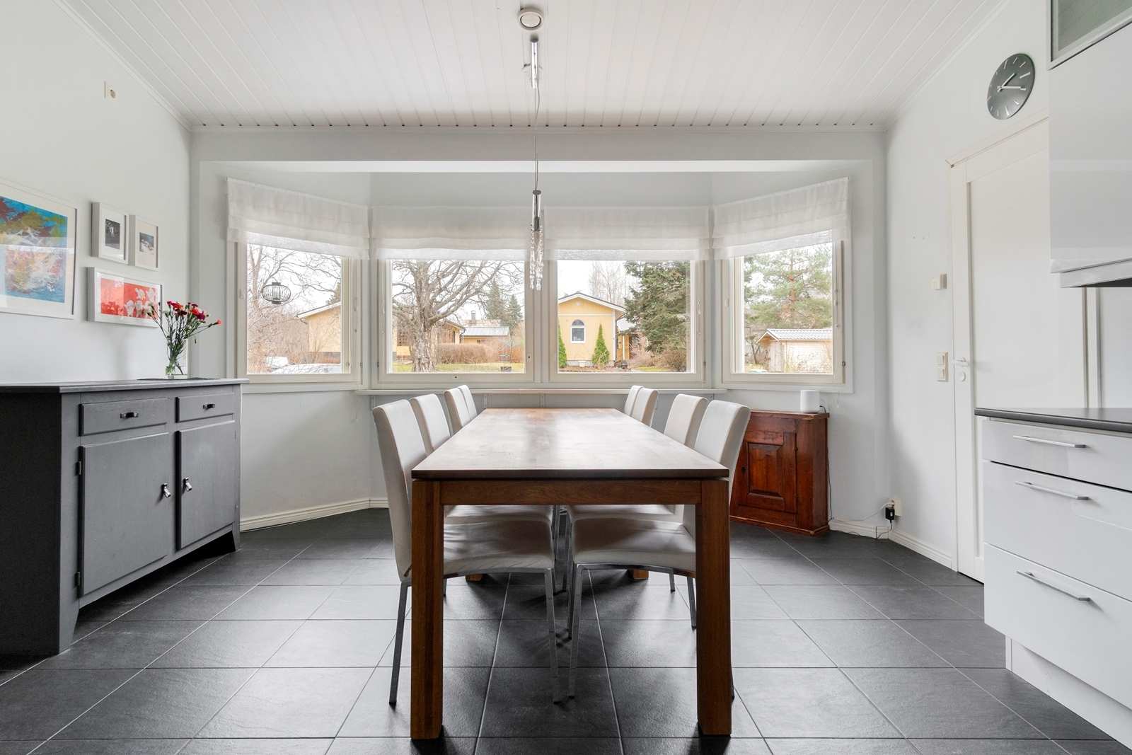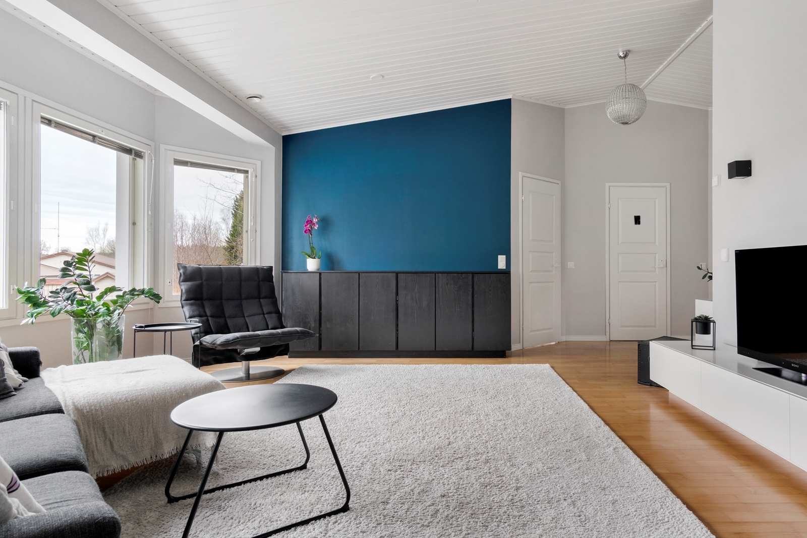 | Olohuone | Valtavan korkea ja komea olohuone. Olohuoneesta käyskentelet isolle terassille takapihalle Seinät: maalattu Lattia: parketti |