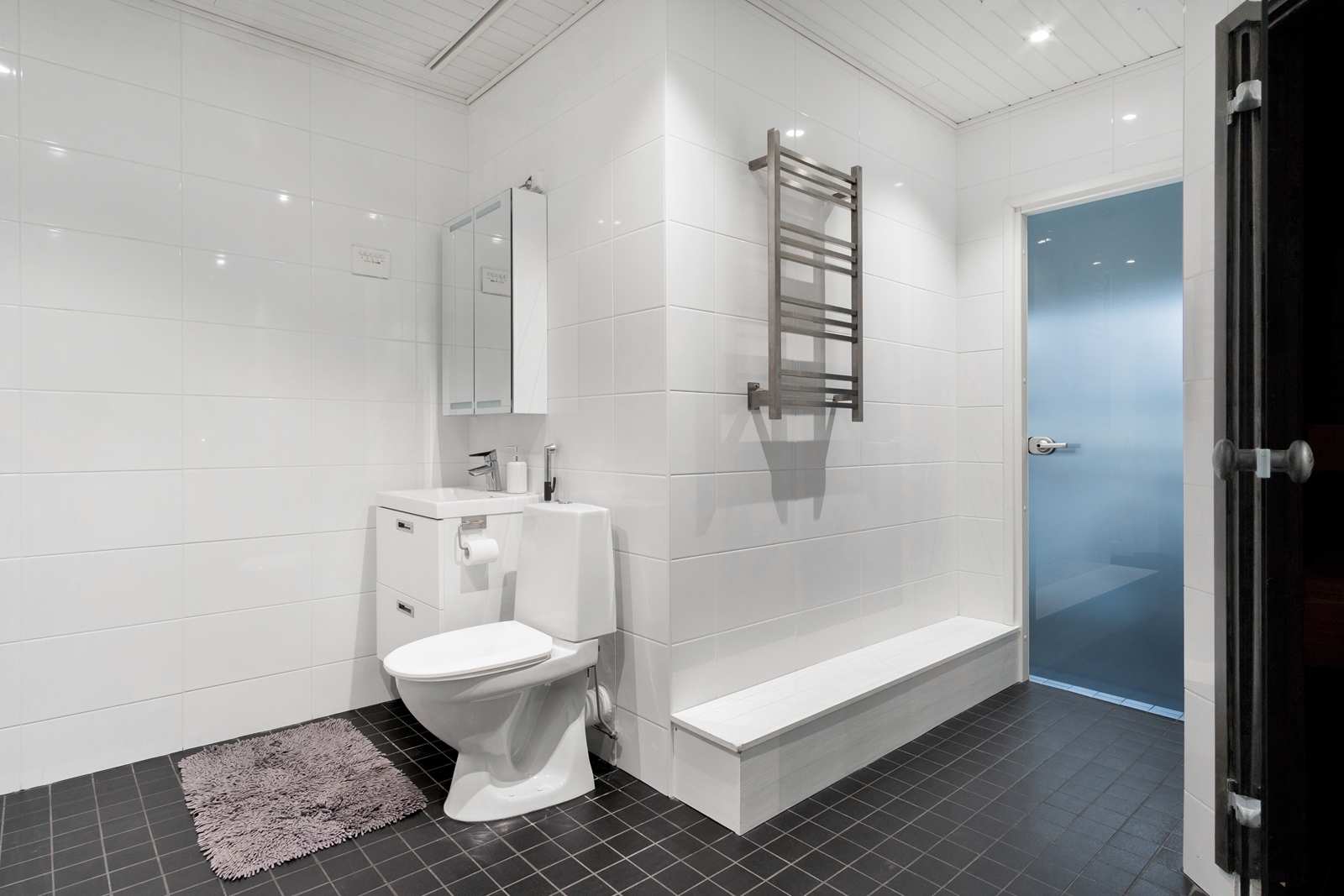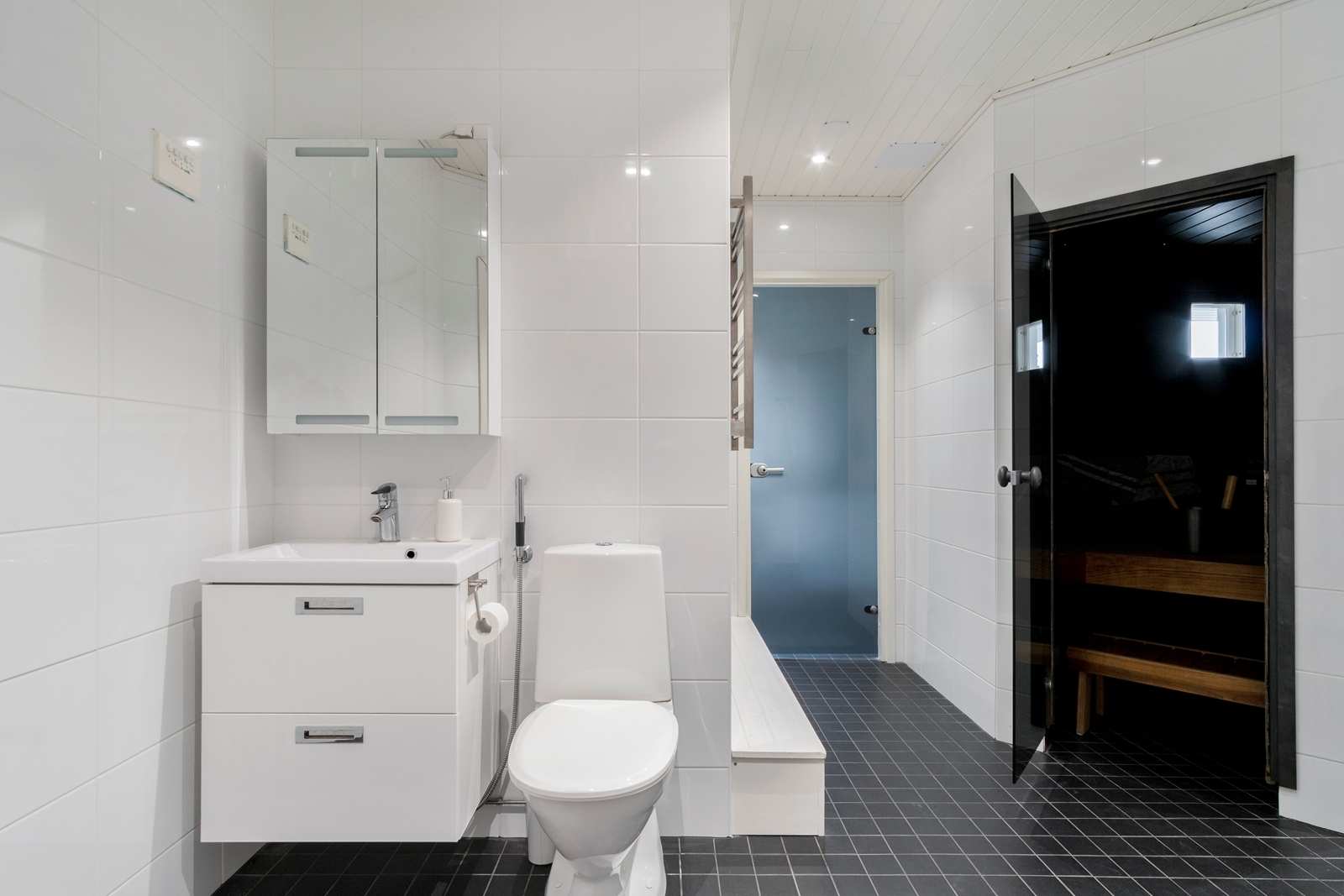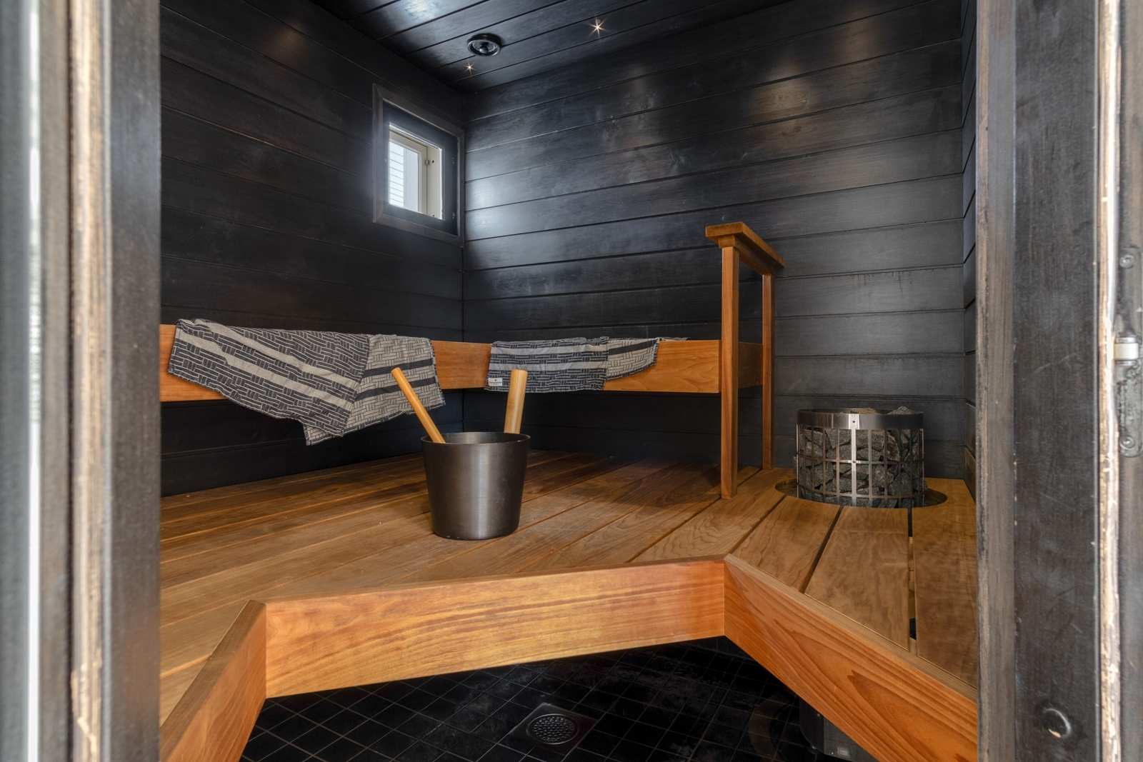 | Saunan pinnat | Seinät: puu Lattia: laatta |