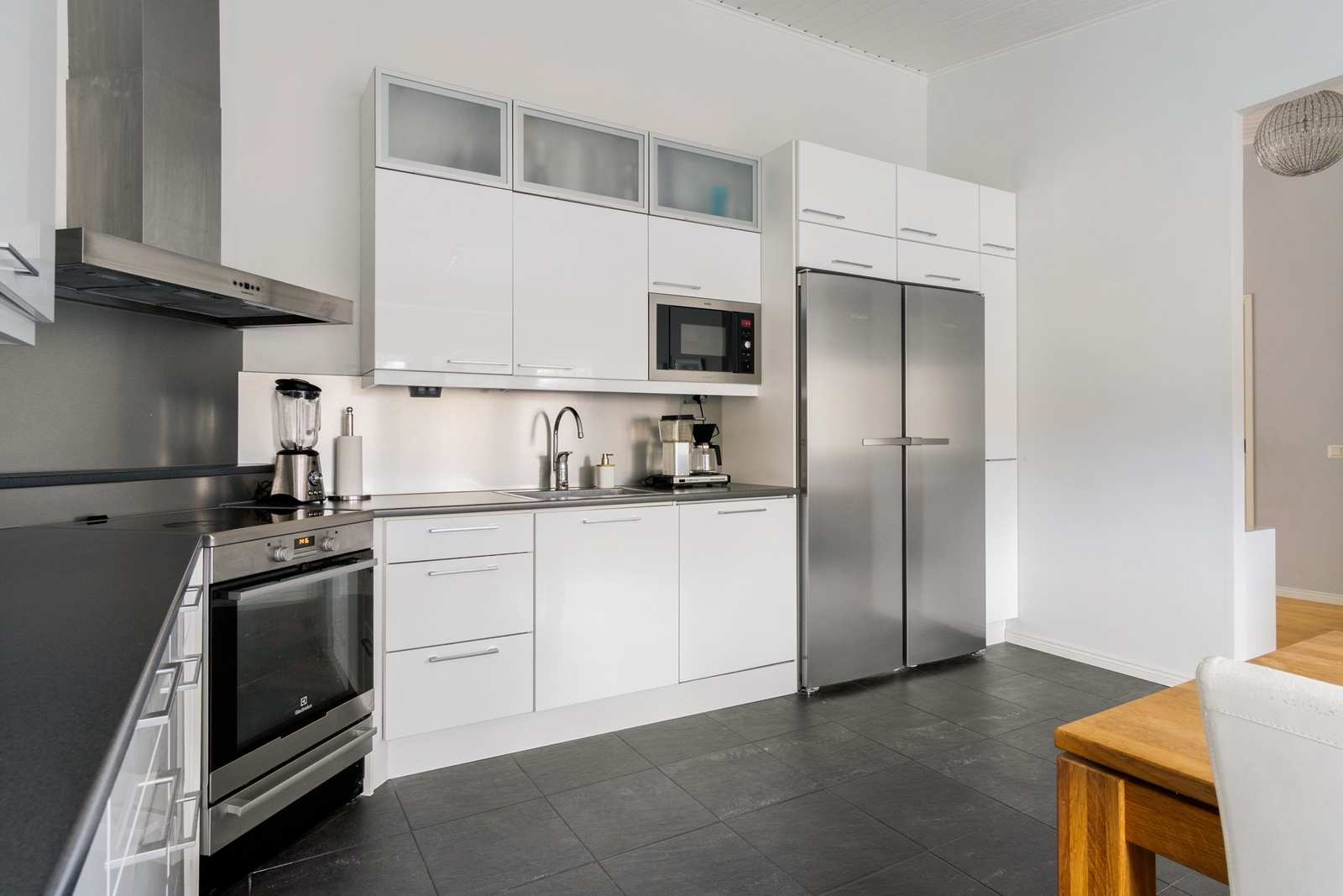 | Keittiön varustus | Jääkaappi ja pakastin: jääkaappi, pakastin Tasot: laminaatti Seinät: maalattu Lattia: laatta Muut varusteet: mikroaaltouuni, astianpesukone, liesituuletin / hormi Liesi/uuni: induktio |