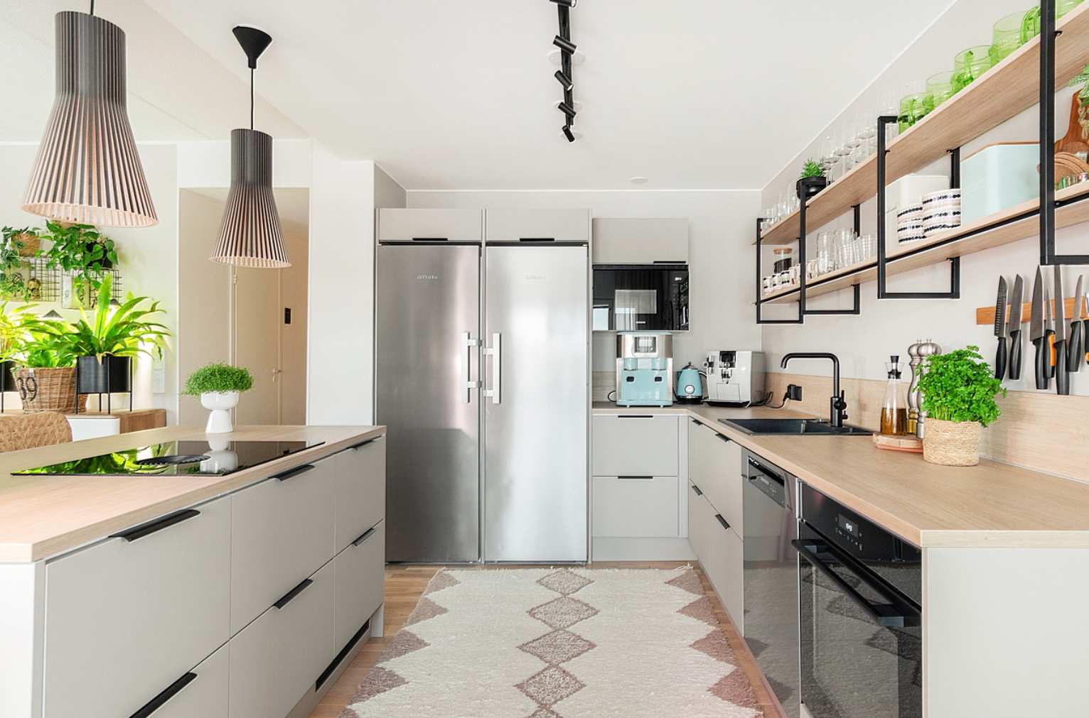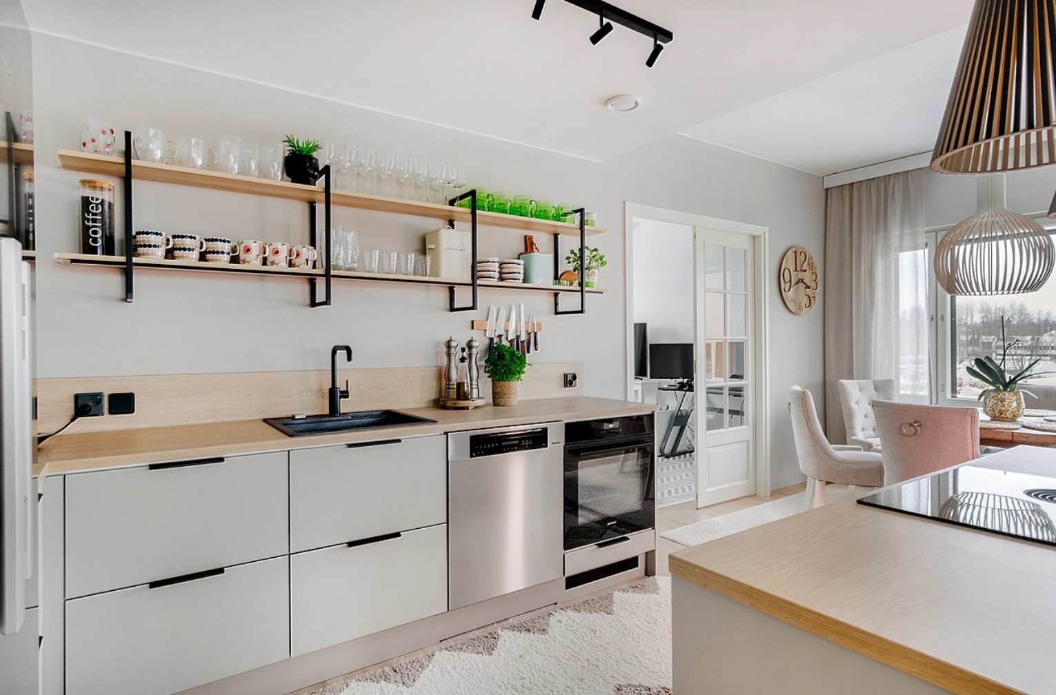| Keittiön varustus | Jääkaappi ja pakastin: jääkaappi, pakastin Tasot: laminaatti Seinät: maalattu Lattia: parketti Muut varusteet: mikroaaltouuni, astianpesukone, liesituuletin / suodatin Liesi/uuni: induktio, erillisuuni |