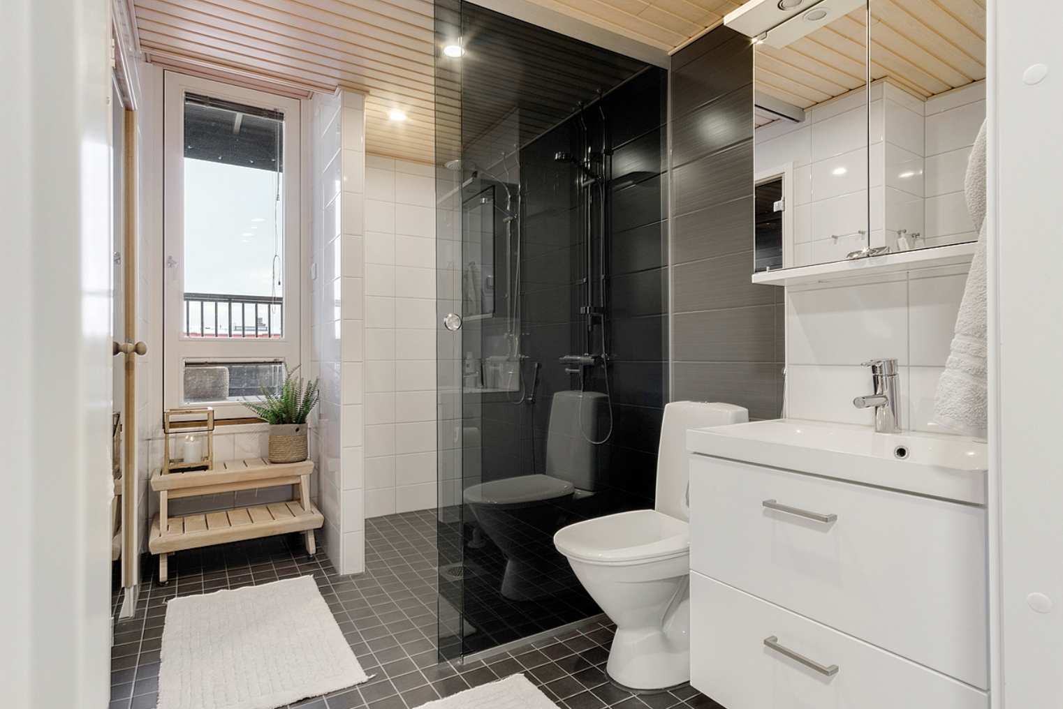 | Kylpyhuone | Varusteet: suihkuseinä, lattialämmitys, wc-istuin, suihku, peilikaappi Seinät: kaakeli Lattia: laatta |