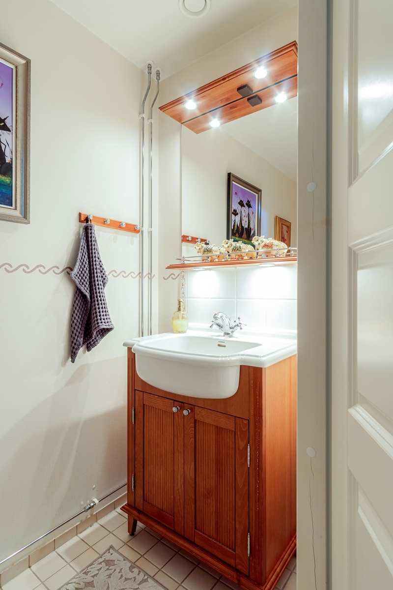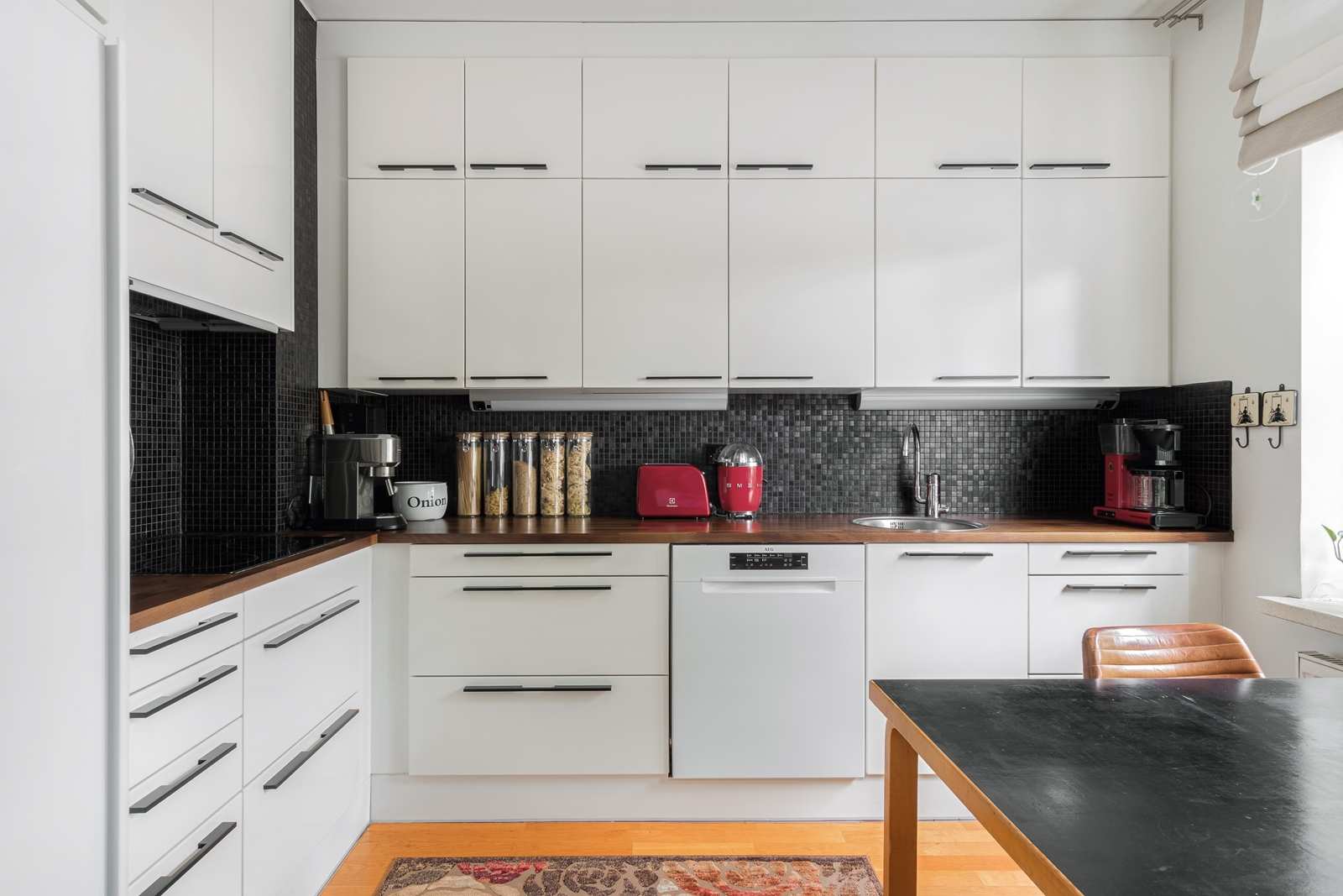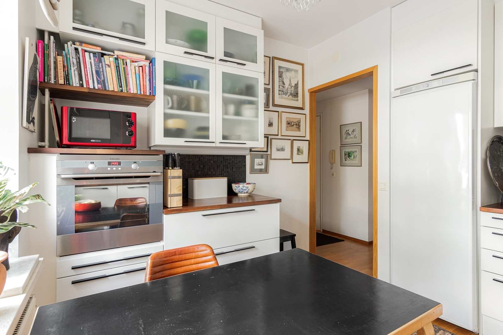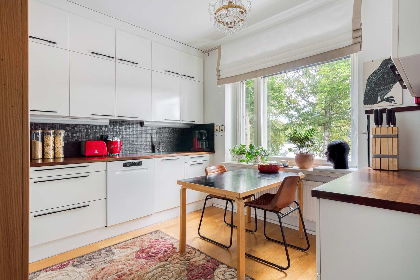 Keittiön varustus | Jääkaappi ja pakastin: jääkaappi, pakastin Tasot: puu Seinät: kaakeli Lattia: parketti Muut varusteet: astianpesukone, liesituuletin / hormi Liesi/uuni: induktio, erillisuuni |
