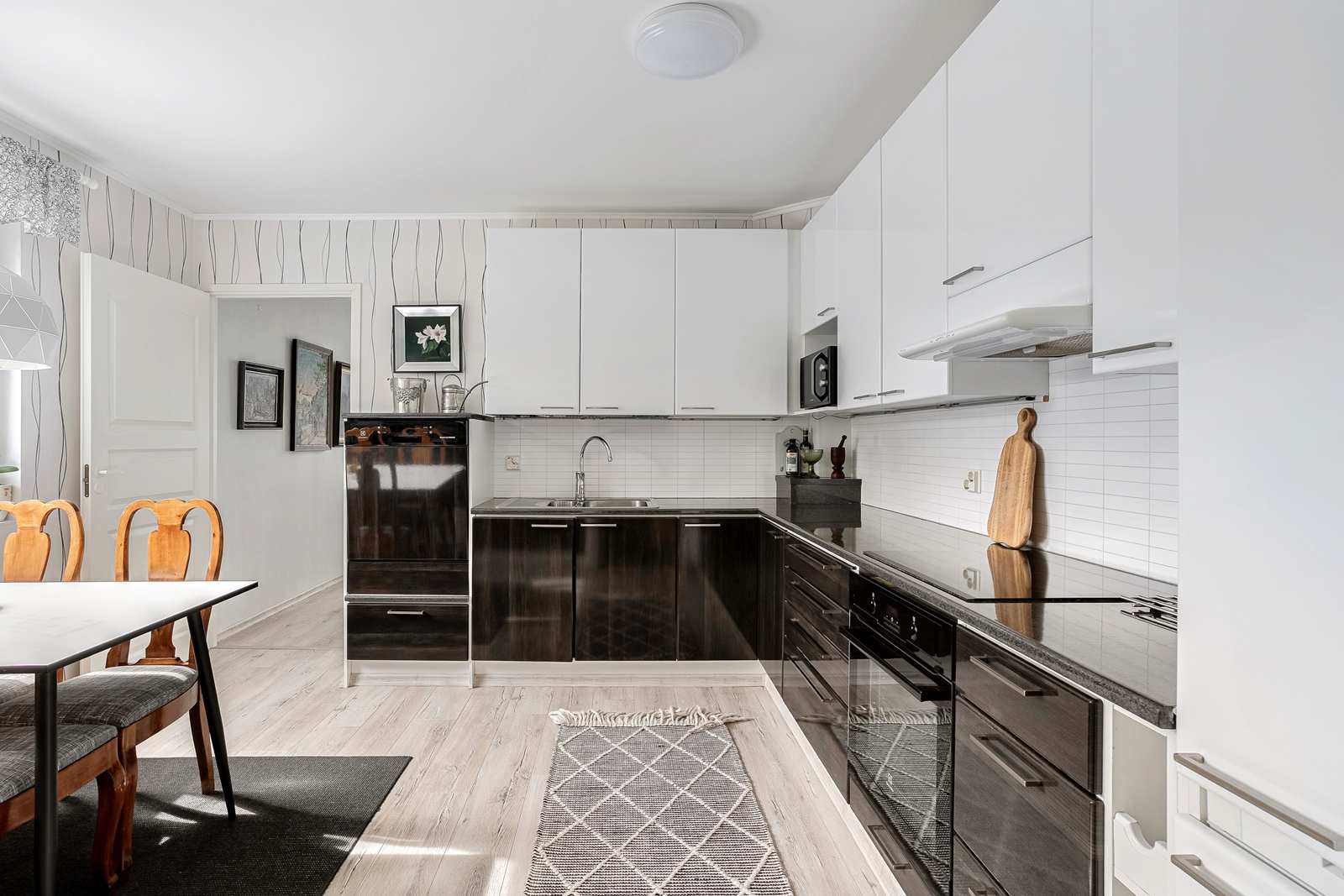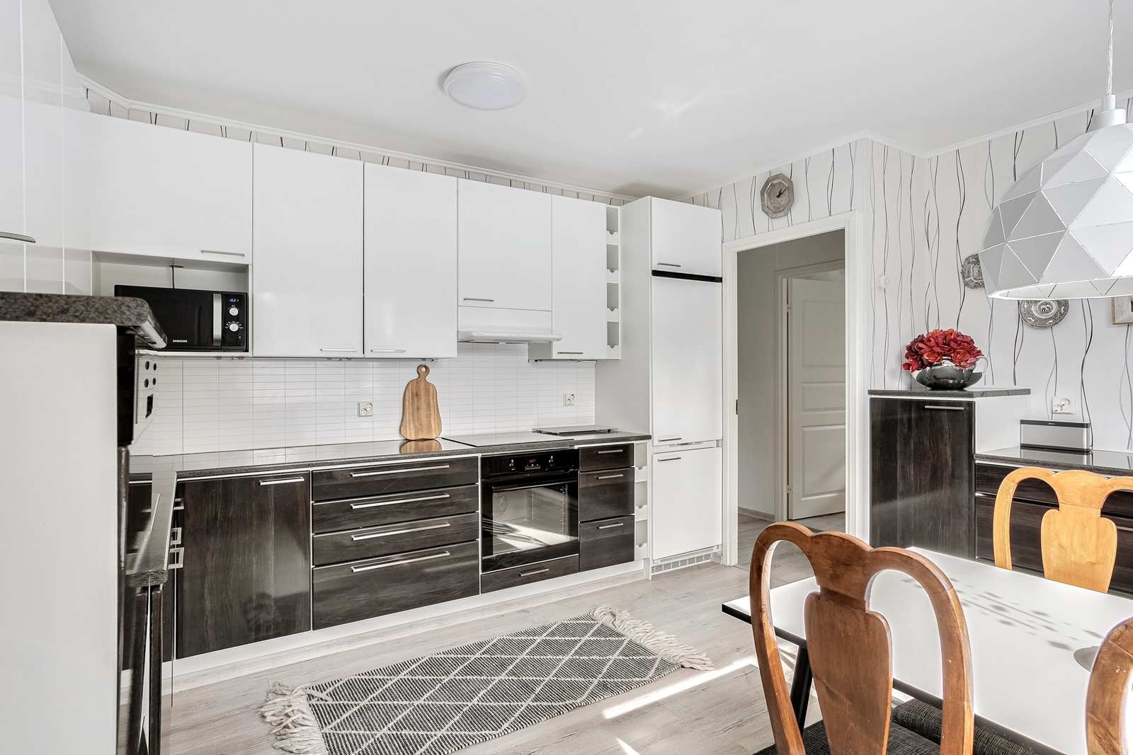 Keittiön varustus | Jääkaappi ja pakastin: jääkaappi/pakastin Tasot: laminaatti Seinät: tapetti Lattia: vinyyli Muut varusteet: mikroaaltouuni, astianpesukone, liesituuletin / suodatin Liesi/uuni: keraaminen |