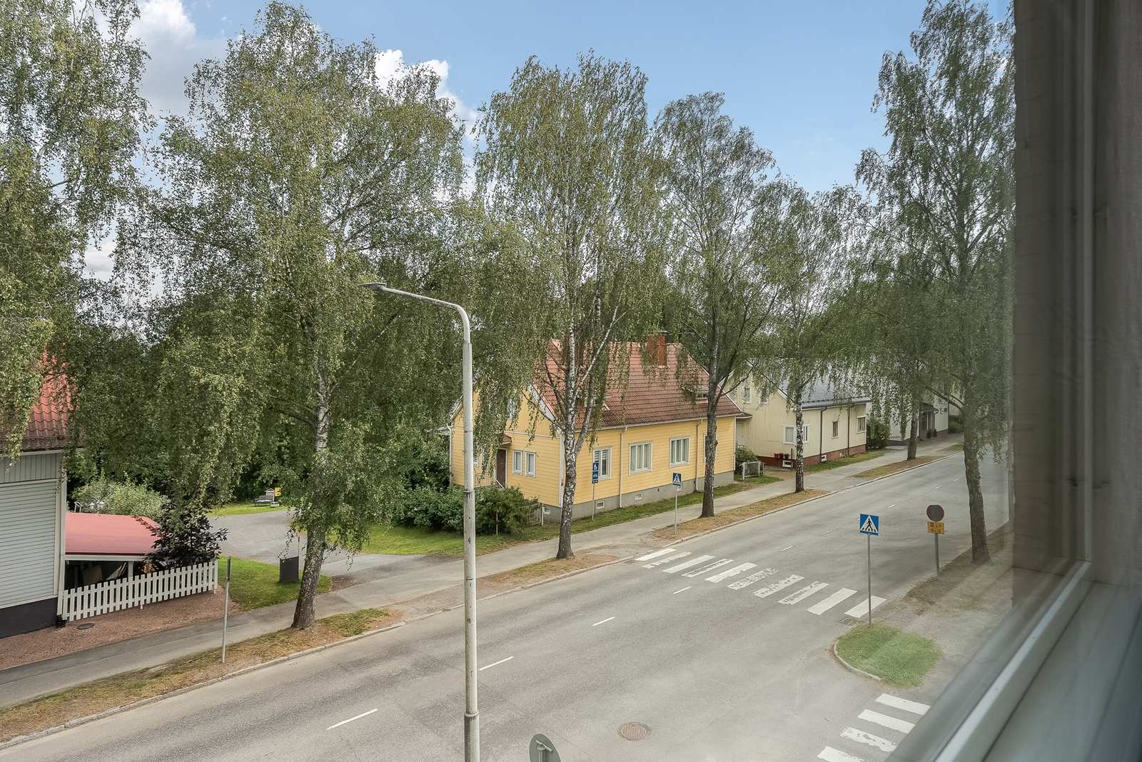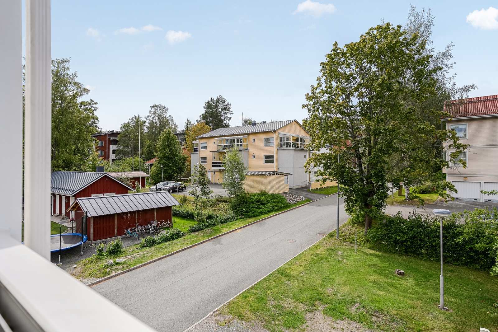 Näkymät | Kadun puolelta näkymää suurten puiden lomasta Lahdensivuntielle, olohuoneesta ja ruokailutilasta vihreät näkymät Myllymäkeen päin. |