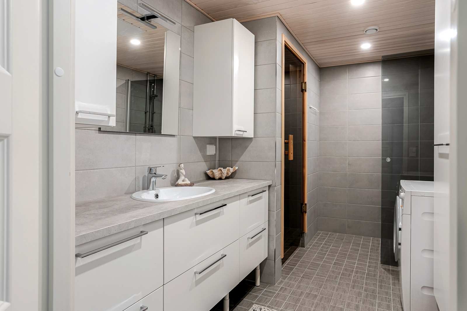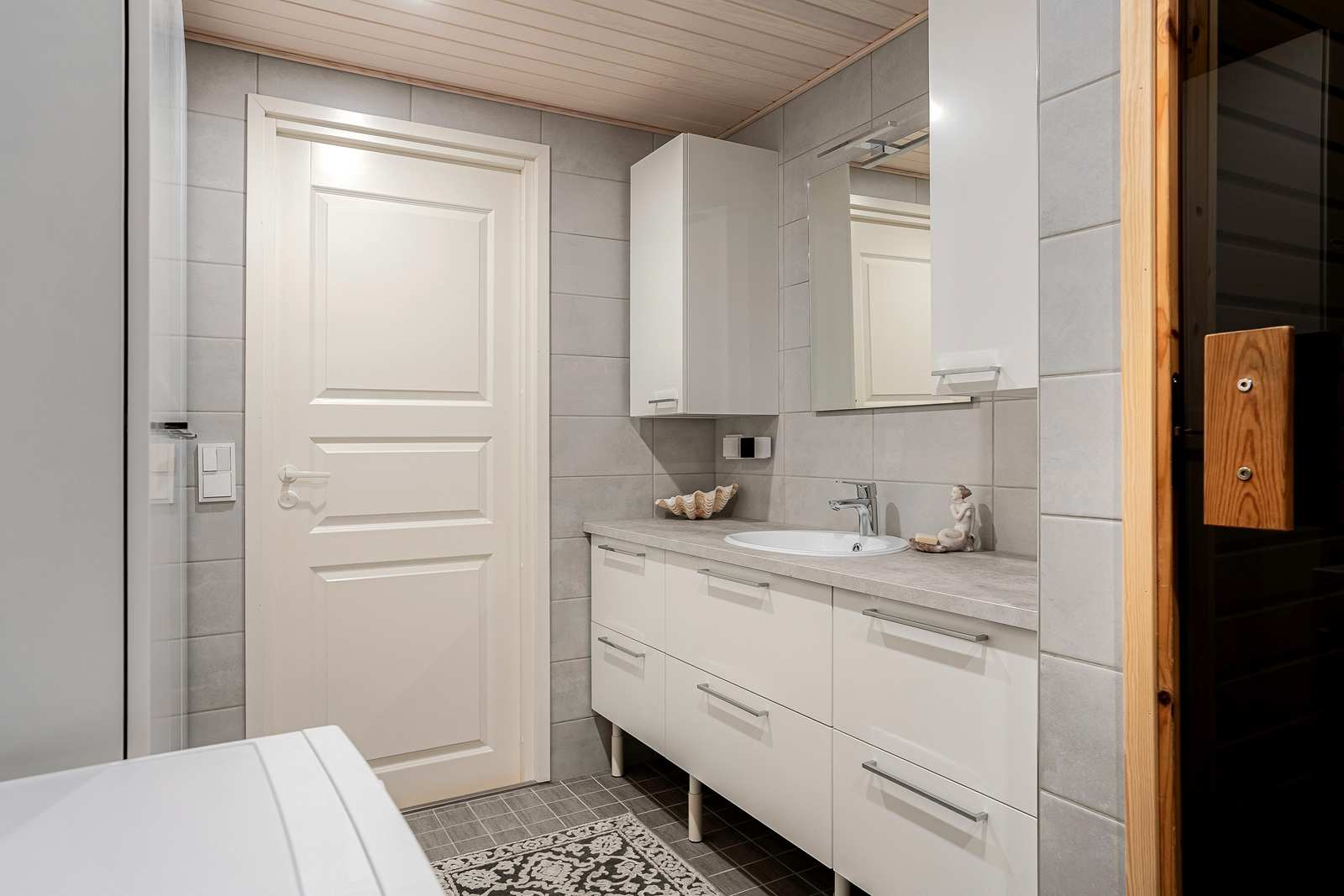 Kylpyhuone | Varusteet: suihkuseinä, pesukoneliitäntä, lattialämmitys, suihku Seinät: kaakeli Lattia: laatta |