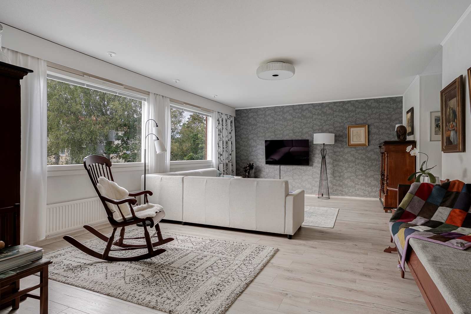 Olohuone | Valtavan suuri ja valoisa olohuone, isot ikkunat ja vapaat maisemat Seinät: tapetti Lattia: vinyyli |
