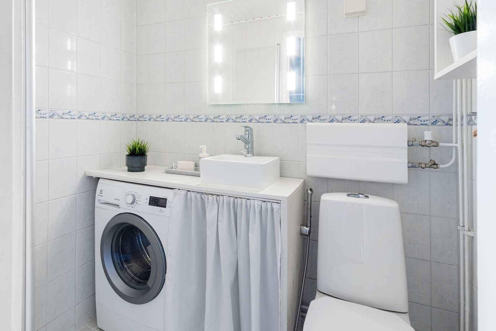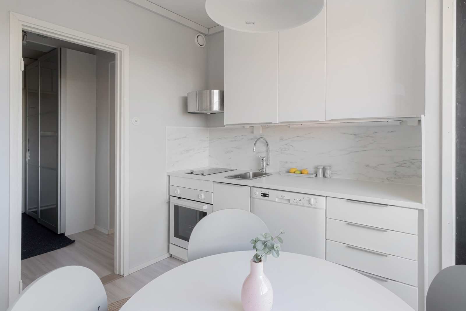 Keittiön varustus | Jääkaappi ja pakastin: jääkaappi Muut varusteet: astianpesukone, liesituuletin / suodatin Tasot: laminaatti Seinät: maalattu Lattia: laminaatti Liesi/uuni: keraaminen, erillisuuni |