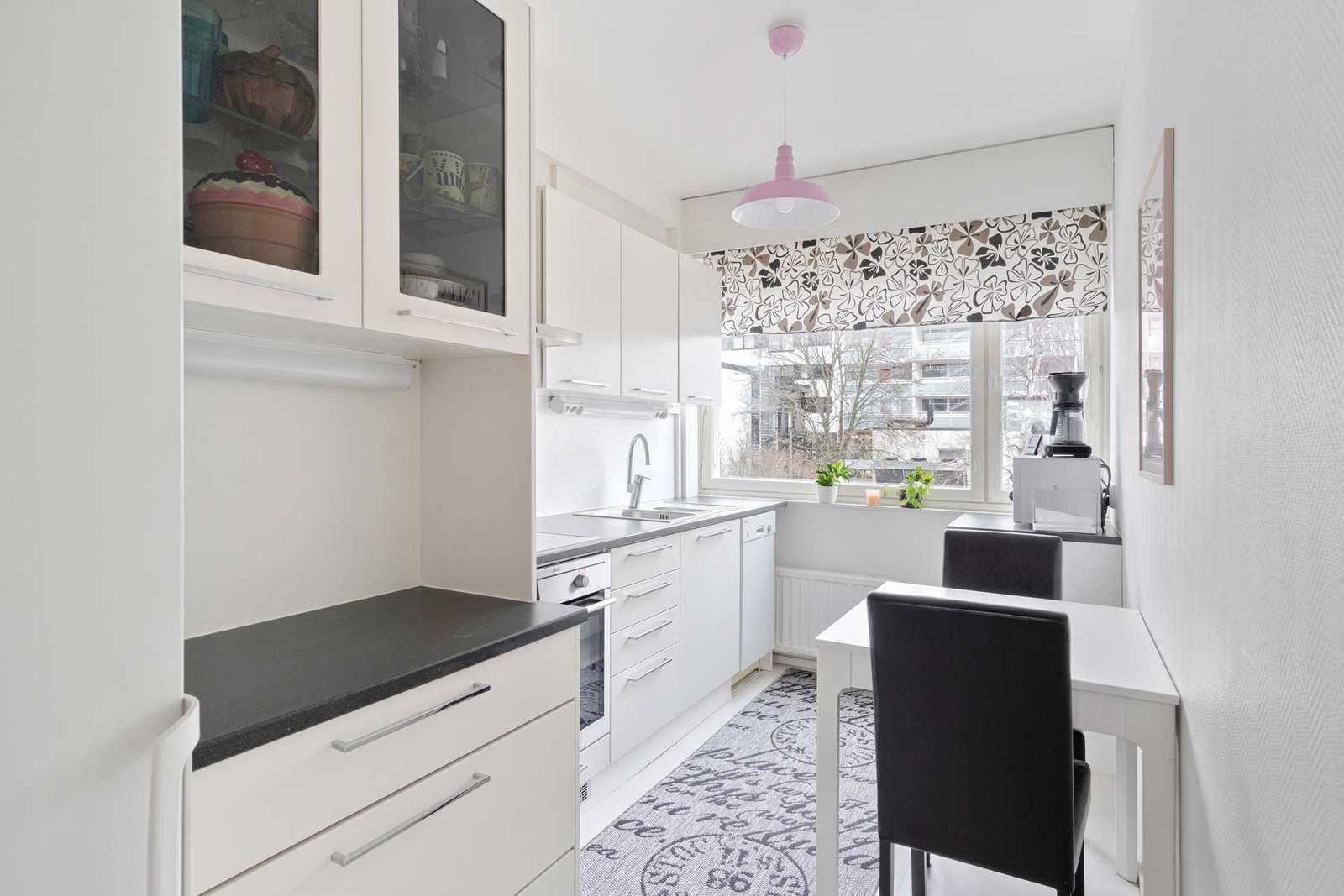 | Keittiön varustus | Jääkaappi ja pakastin: jääkaappi/pakastin Muut varusteet: liesituuletin, astianpesukone Tasot: laminaatti Seinät: maalattu Lattia: laminaatti Liesi/uuni: keraaminen |