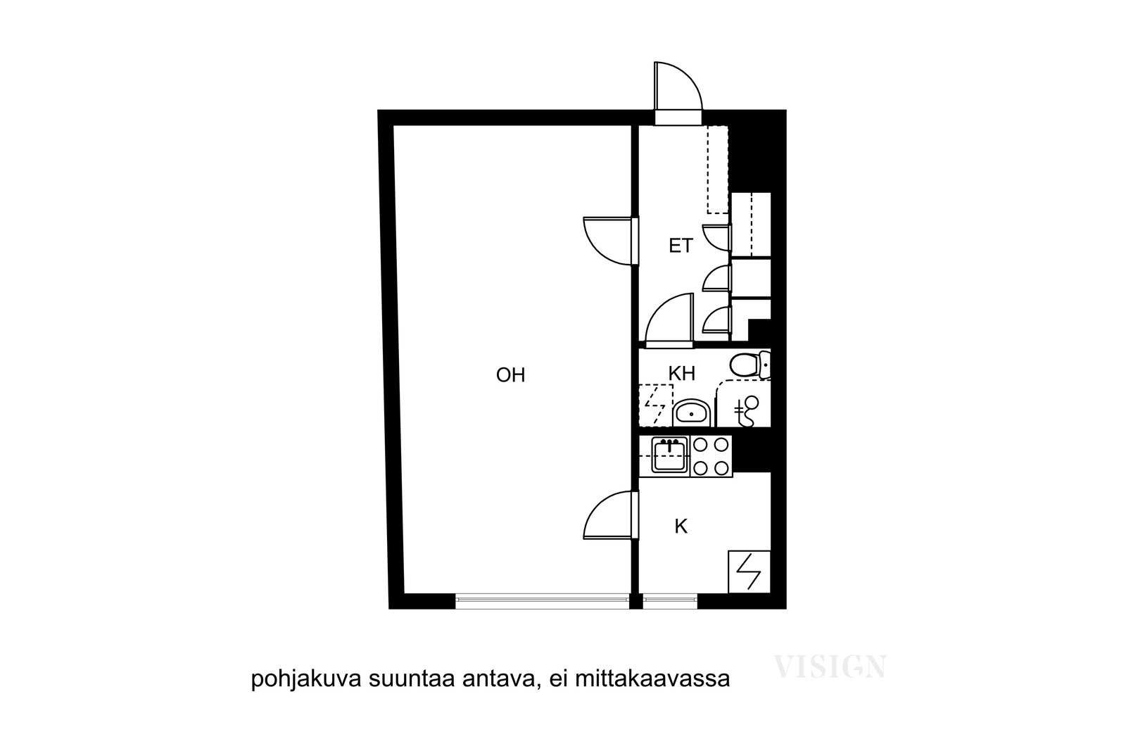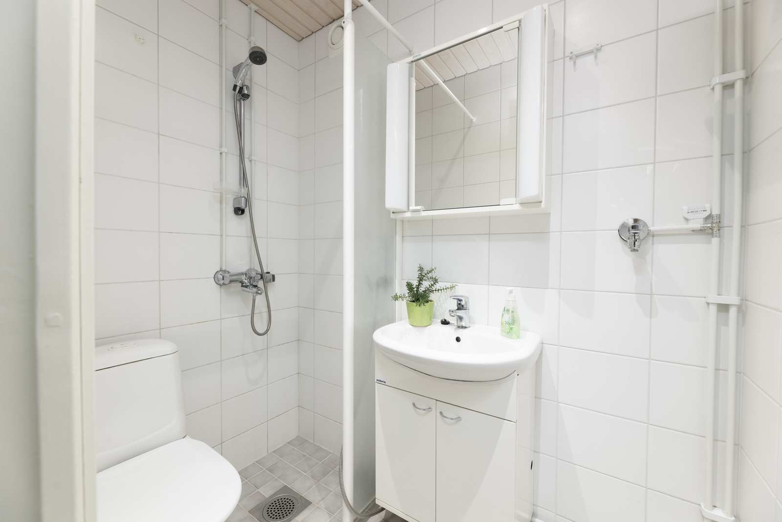 | Kylpyhuone | Varusteet: pesukoneliitäntä, lattialämmitys, wc-istuin, suihku, peilikaappi Seinät: kaakeli Lattia: laatta |