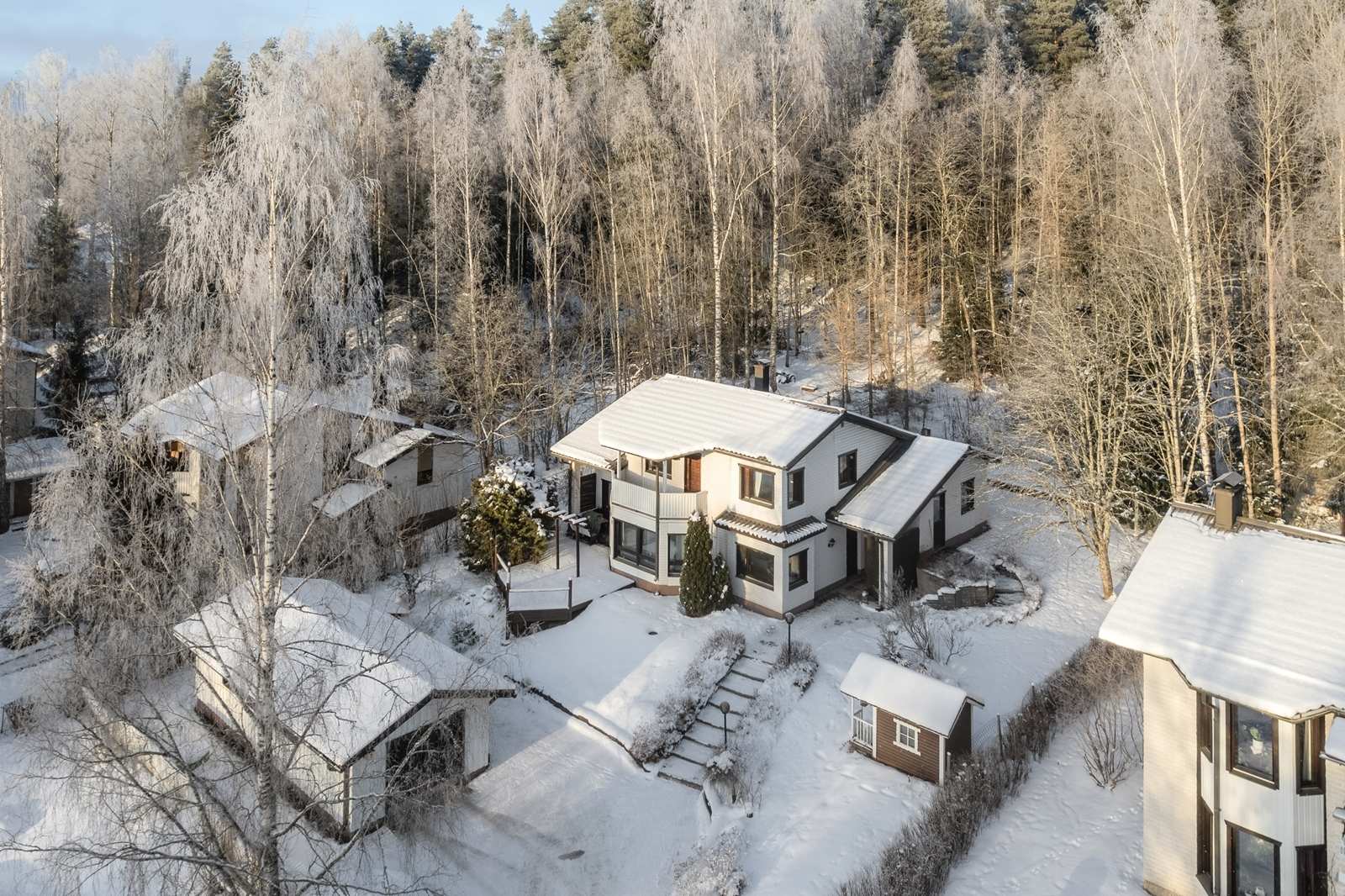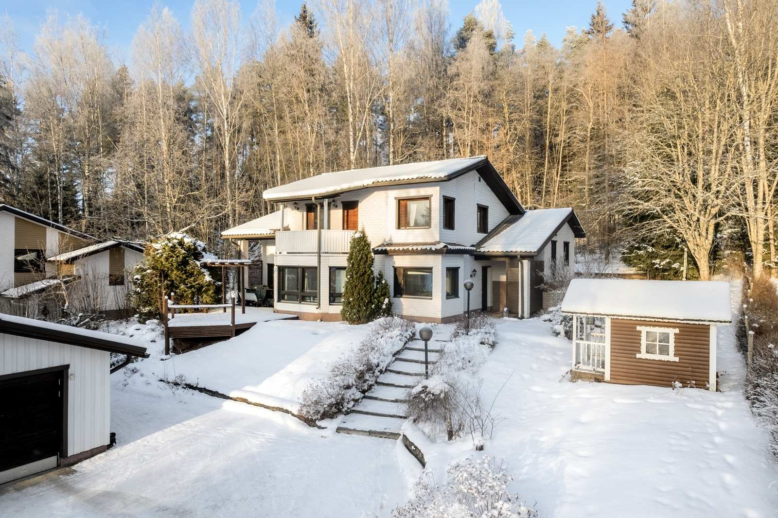 Arkkitehdin suunnittelema, mielenkiintoisesti kolmeen tasoon porrastettu valkotiilitalo. Kauniiksi remontoitu ja monin tavoin vuosien varrella paranneltu. Alakerrassa keittiö ja tilava olohuone, jonka jatkeena suuri terassi. Erkkerissä mainio tila isommallekin ruokapöydälle. Keskimmäisellä tasolla takkahuone, sauna, pesuhuone, kodinhoitotila sekä askarteluhuone. Ylin taso varattu yöuniin kolmessa makuuhuoneessa ja parvella, täällä myös wc. Suurimmasta makuuhuoneesta pääset parvekkeelle pudistelemaan petivaatteita tai nauttimaan maisemista. Suosittu, lapsiystävällinen alue. Turvallinen sijainti päättyvän kadun loppupäässä. Metsään rajoittuva, rauhaisa tontti. Alapihalla autotalli/ varasto. Lapsille leikkimökki. Ei ihan tavallinen tapaus siis. Sovi oma esittelyaikasi.