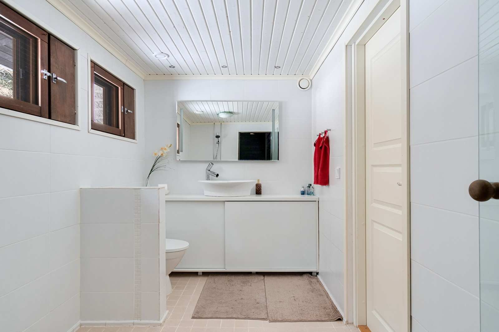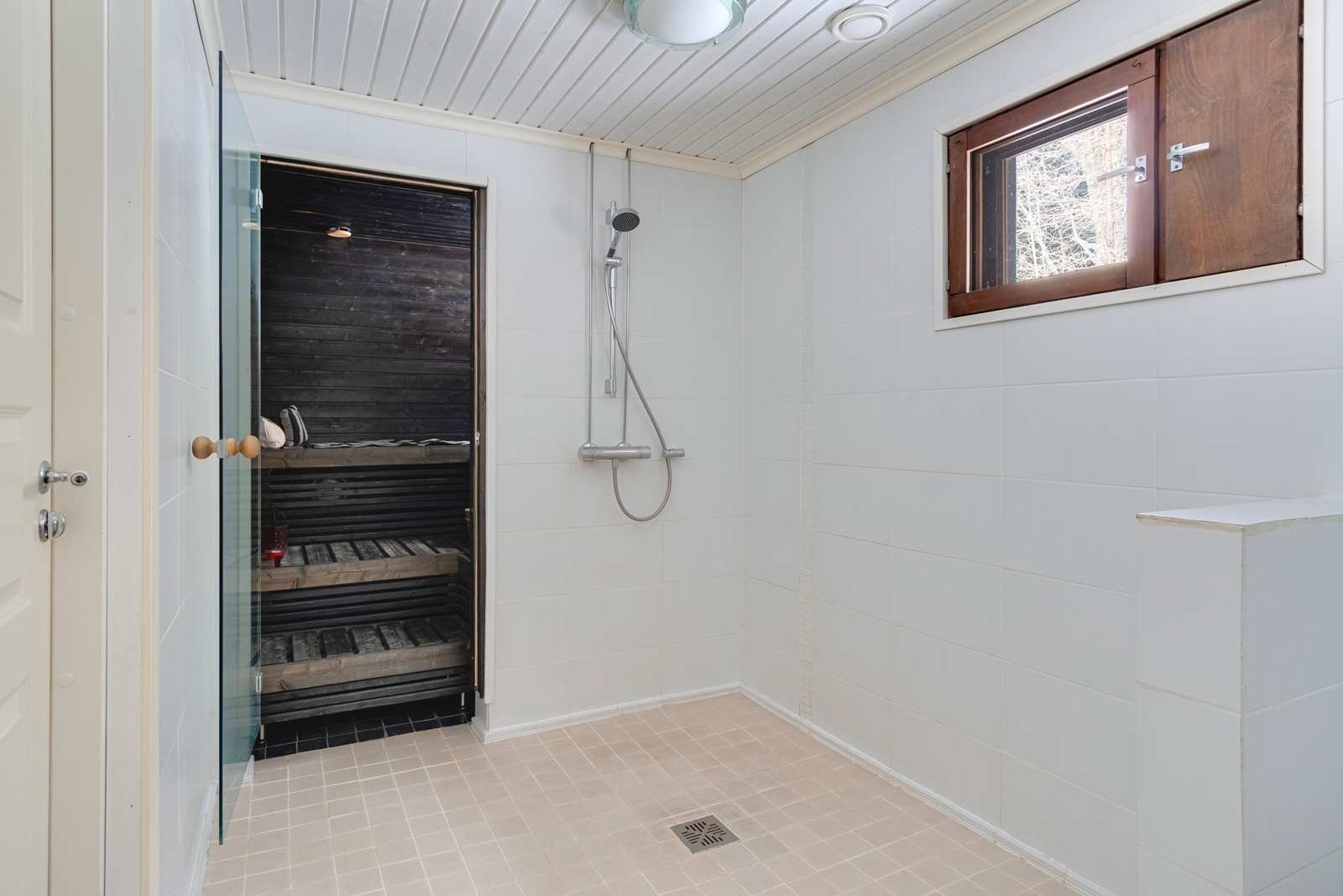 | Saunan pinnat | Seinät: puu Lattia: laatta |