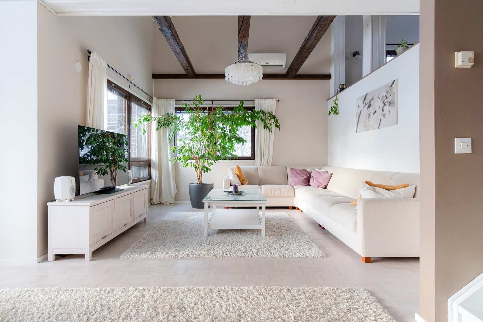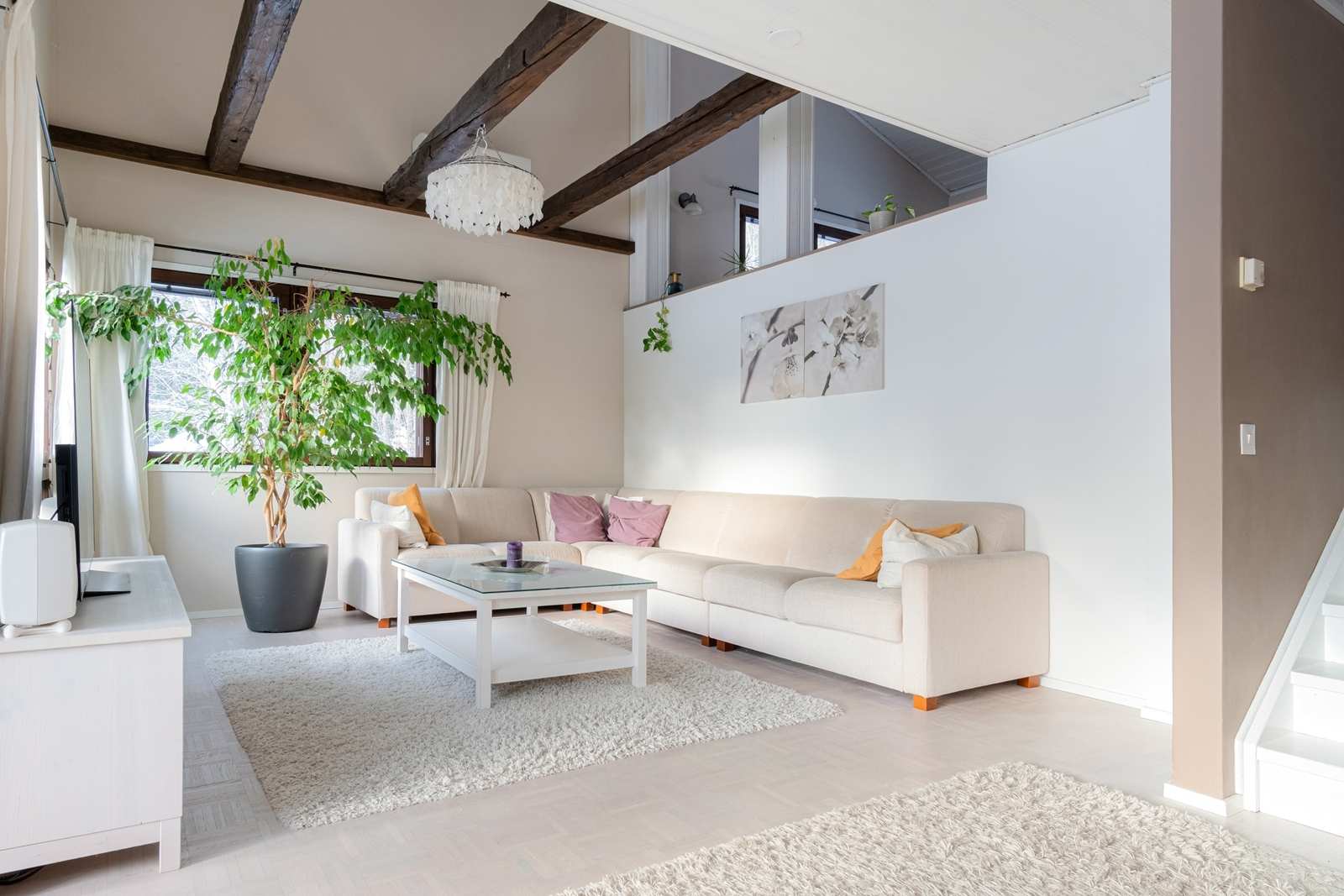 | Olohuone | Kaunis, vaaleaksi hiottu ja Osmocolorilla värjätty mosaiikkiparketti (Parketti Suvala) Seinät: maalattu Lattia: parketti |