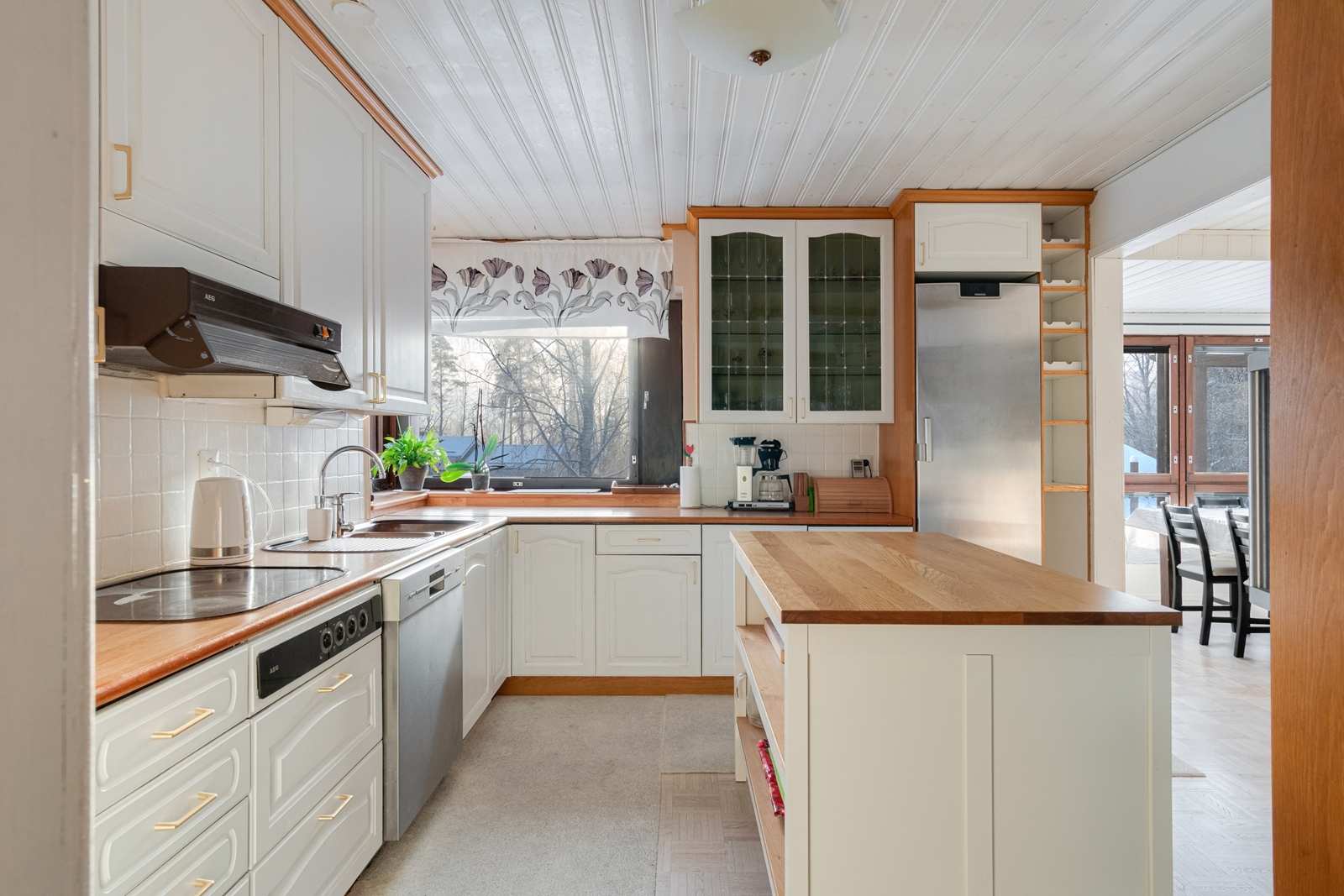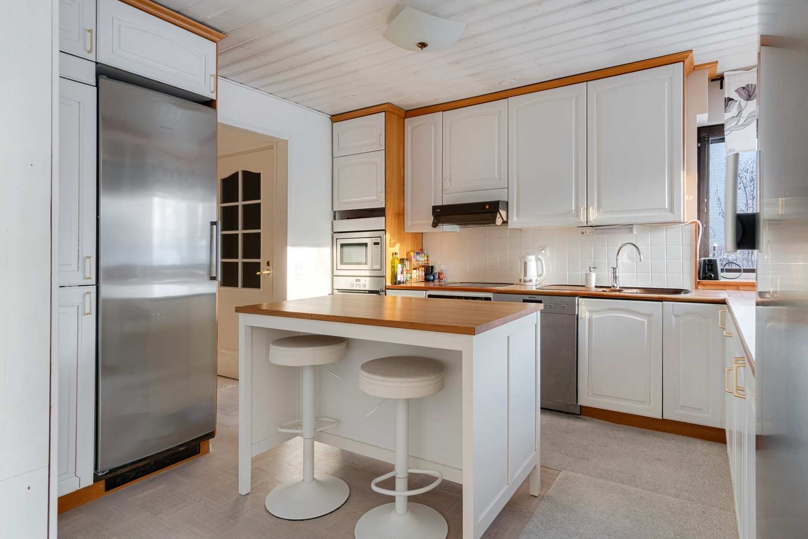 | Keittiön varustus | Jääkaappi ja pakastin: jääkaappi, pakastin Tasot: laminaatti Seinät: kaakeli, maalattu Lattia: parketti Muut varusteet: mikroaaltouuni, astianpesukone, liesituuletin / hormi Liesi/uuni: keraaminen |