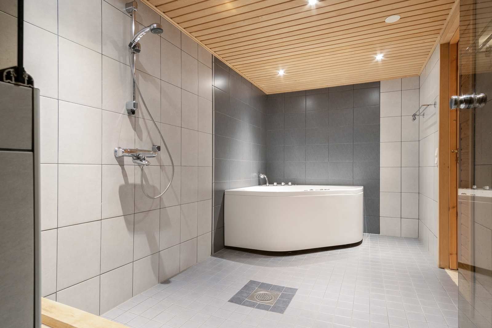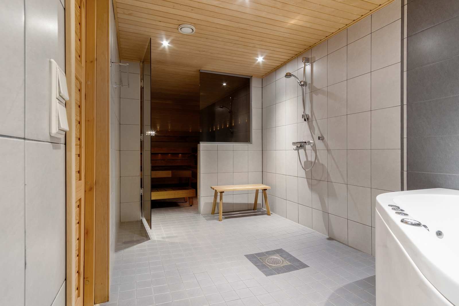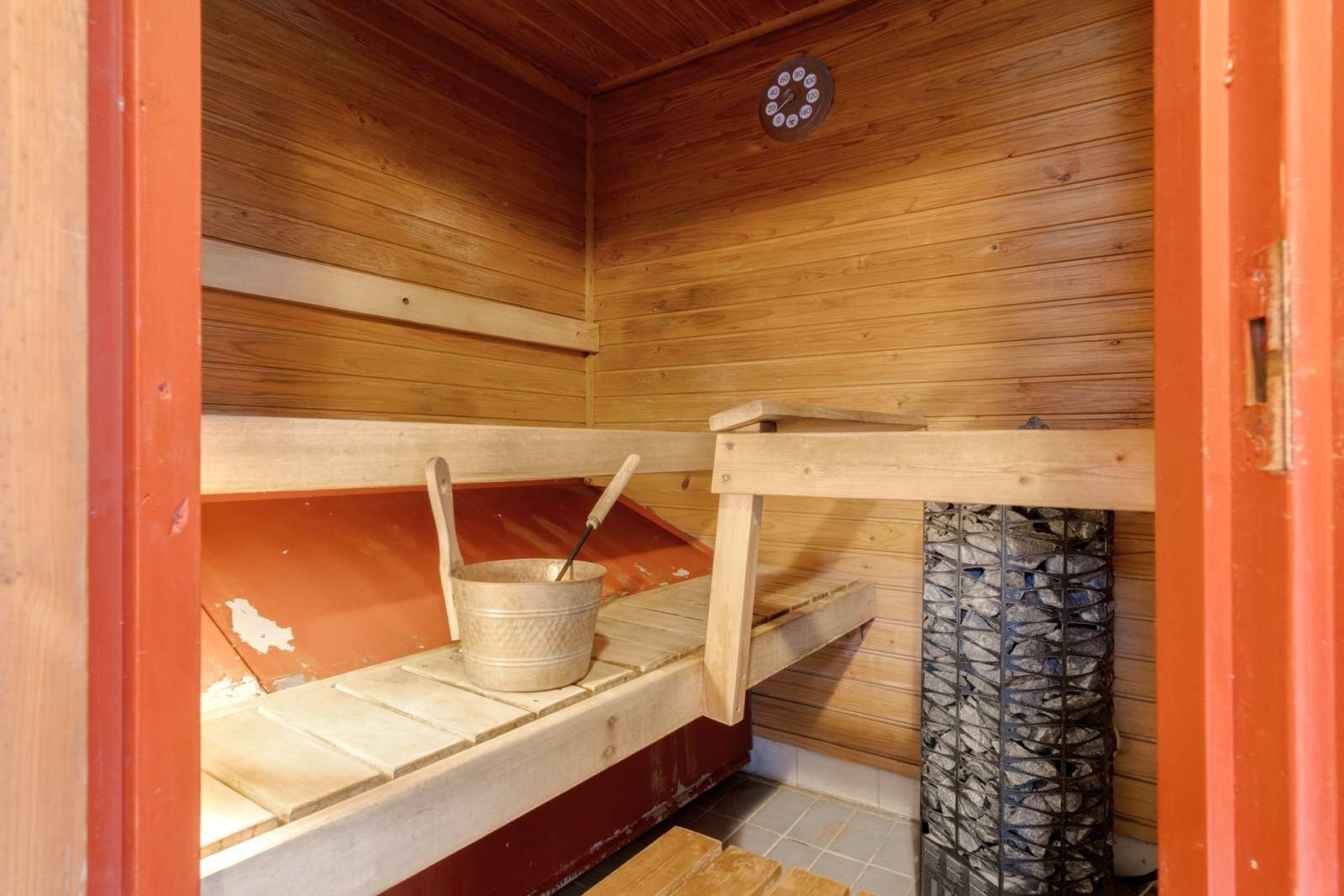 | Saunan pinnat | Seinät: puu Lattia: laatta |