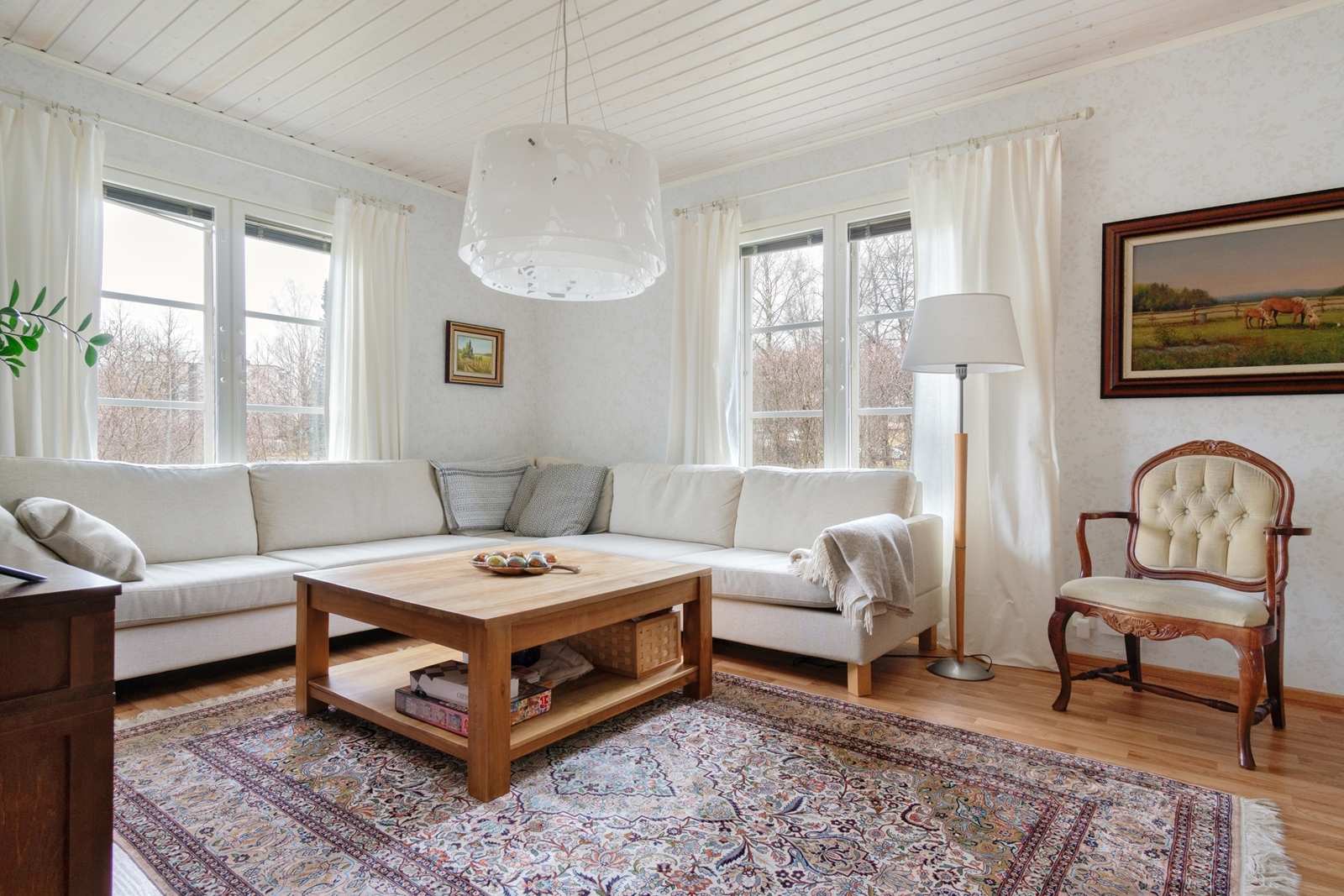 | Olohuone | Kivat kulmaikkunat olohuoneesta Seinät: tapetti Lattia: vinyyli |