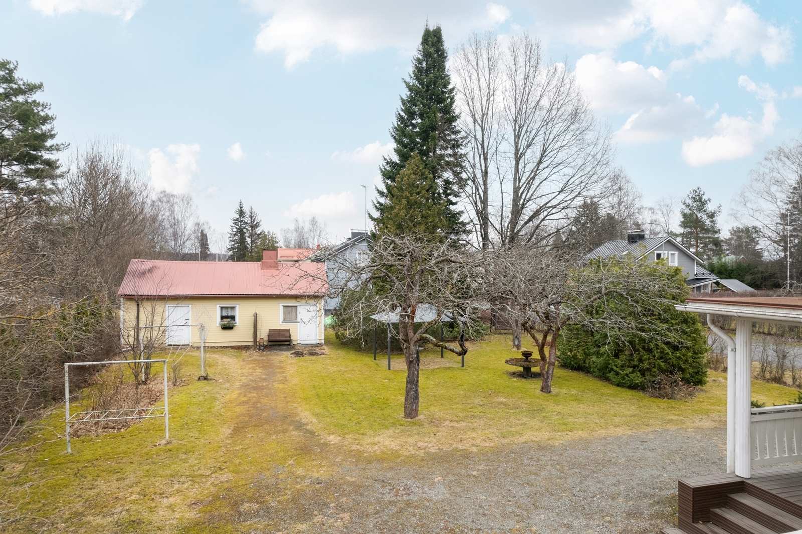| Maasto | Nurmikkoinen piha- alue. Vanhat omenapuut. Kaivo kasteluun. Tilaa on leikkiä ja pelata |