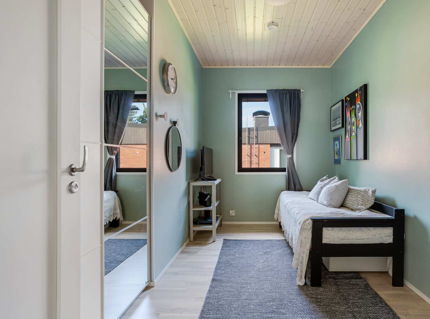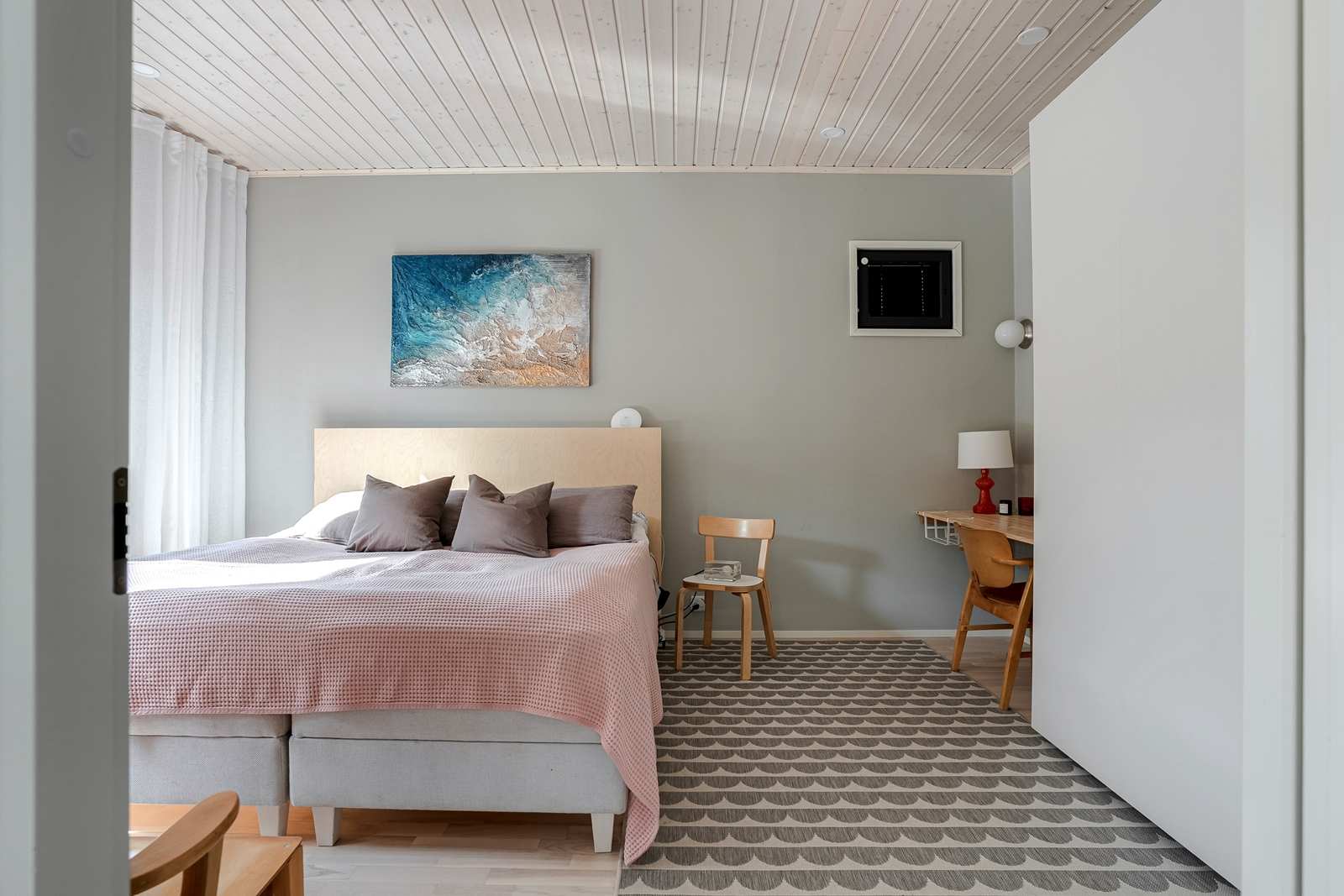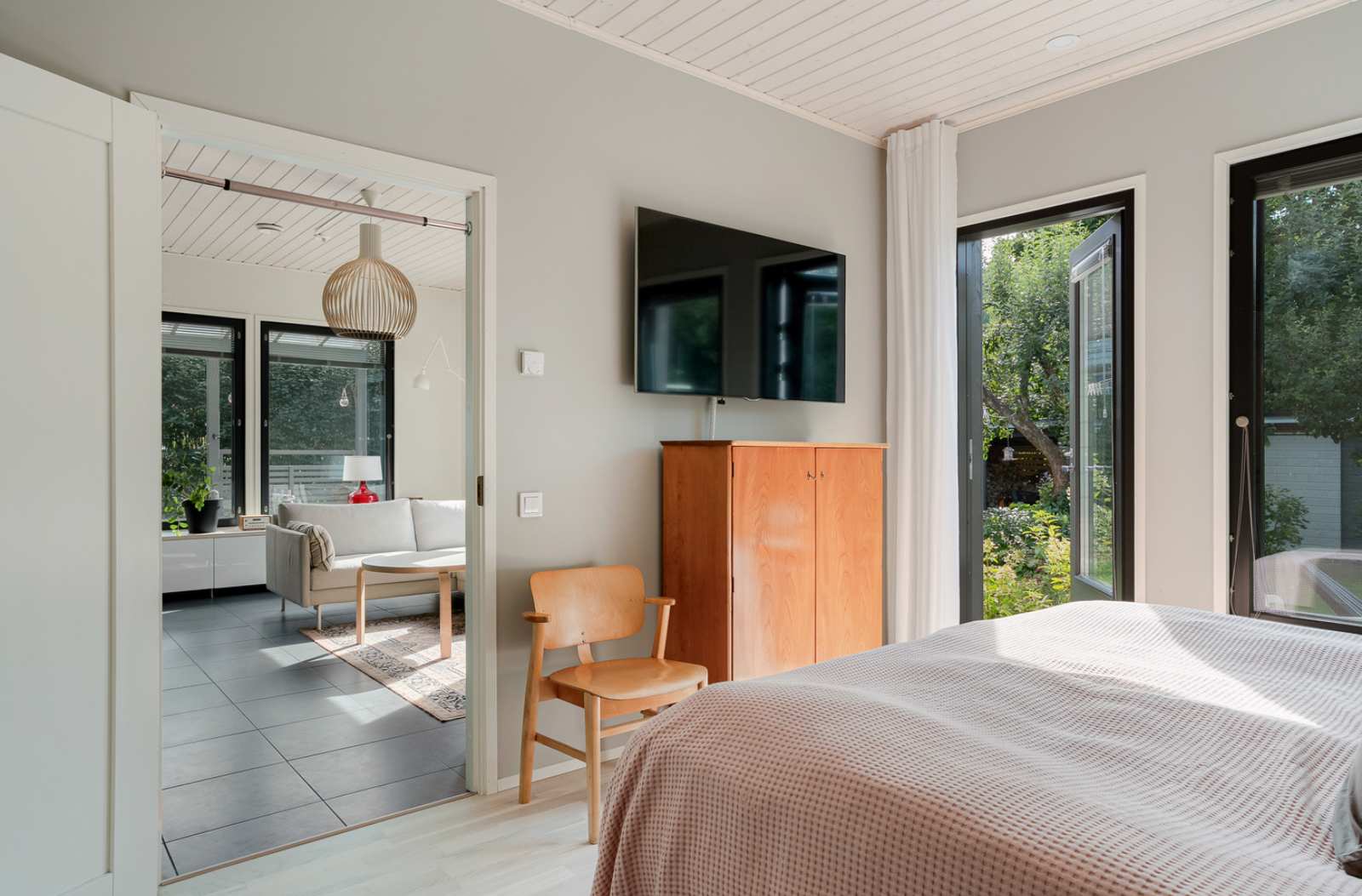 Makuuhuone | Makuuhuoneissa vaaleat parkettilattiat. Olohuoneen viereisestä makuuhuoneesta uloskäynti terassille. |
