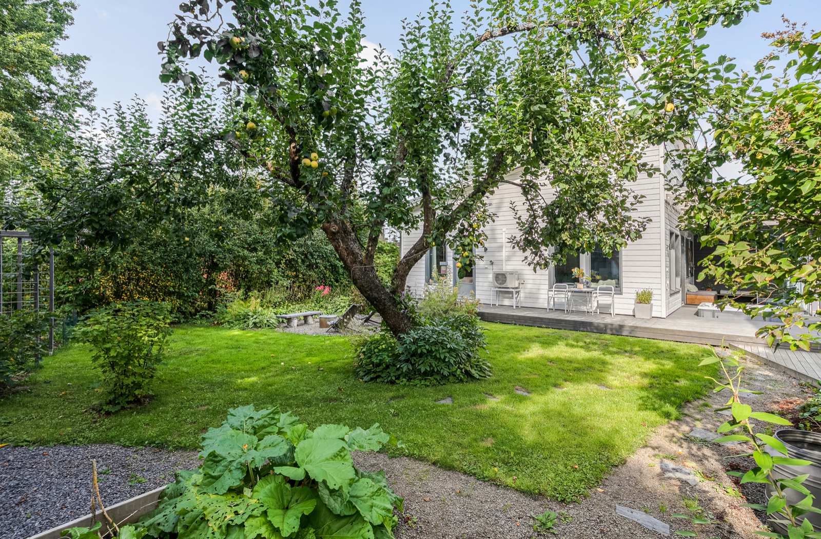 Maasto | Pihaa reunustavat tuuheat pensasaidat. Pihassa kasvimaa, perennapenkkejä, marjapensaita, omenapuita. Laatta - ja sorapolkuja. Nuotiopaikka. Kylmä varasto pihatavaroille ja polttopuille. |